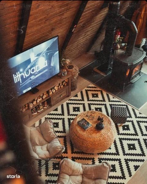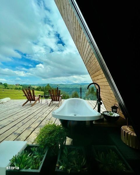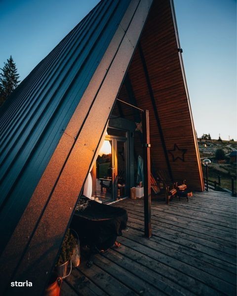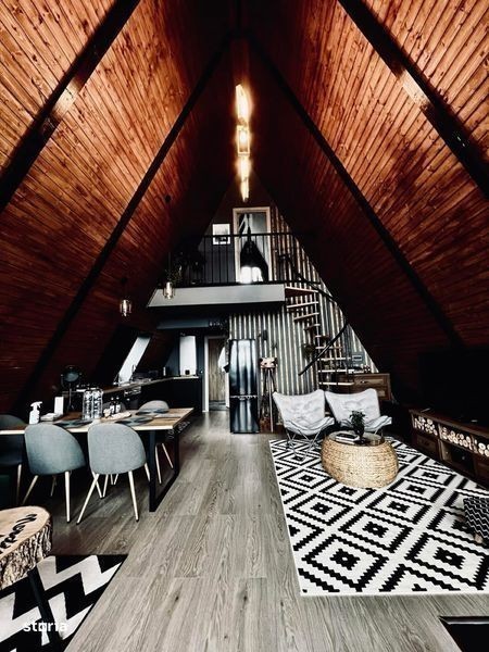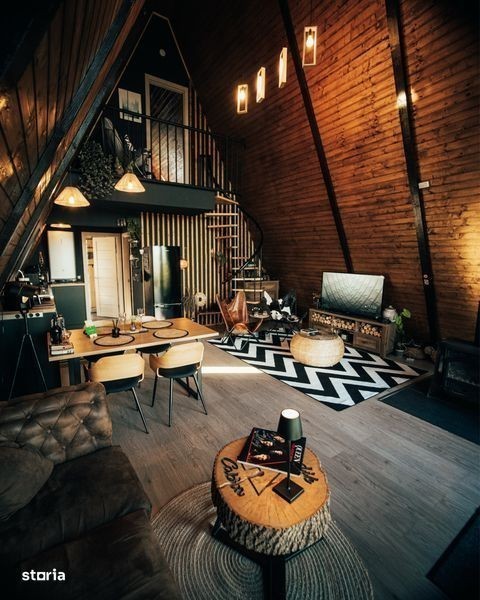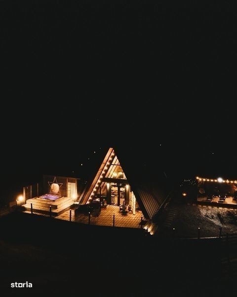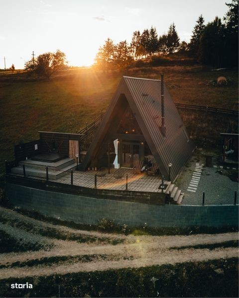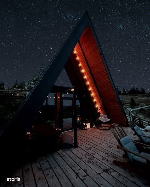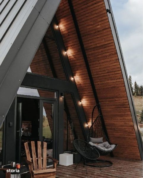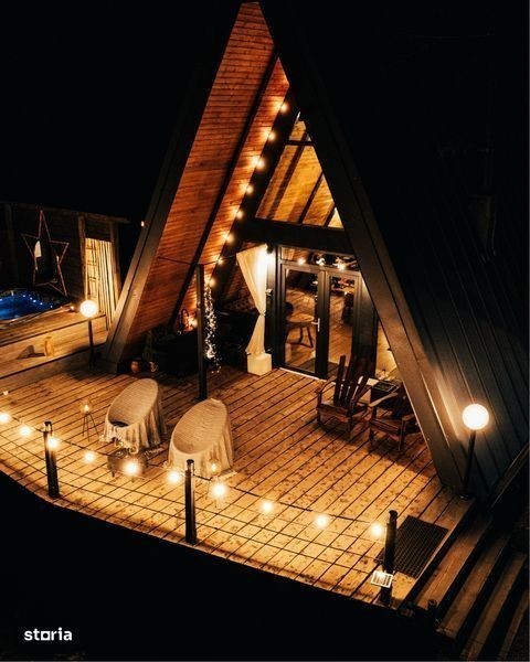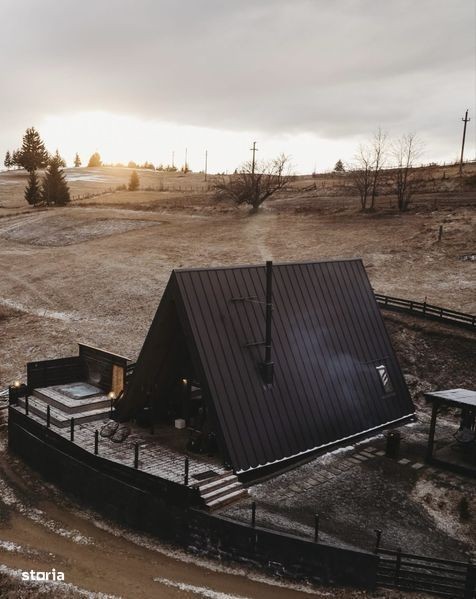 Vand cabana Aframe 110 mp utili, doua dormitoare, living + bucatarie open space, foisor, jacuzzi electric, cada panoramica free stile, terasa 50 mp. Incalzire cu semineu, iar in dormitoare si baie panouri electrice! 1500 mp teren.
