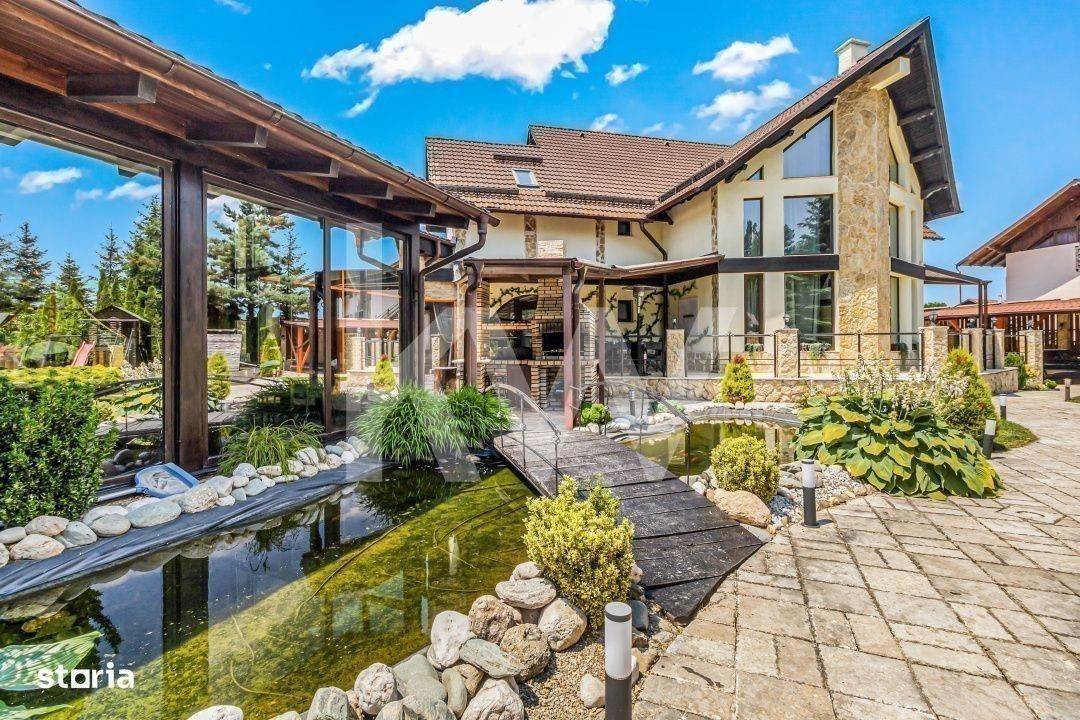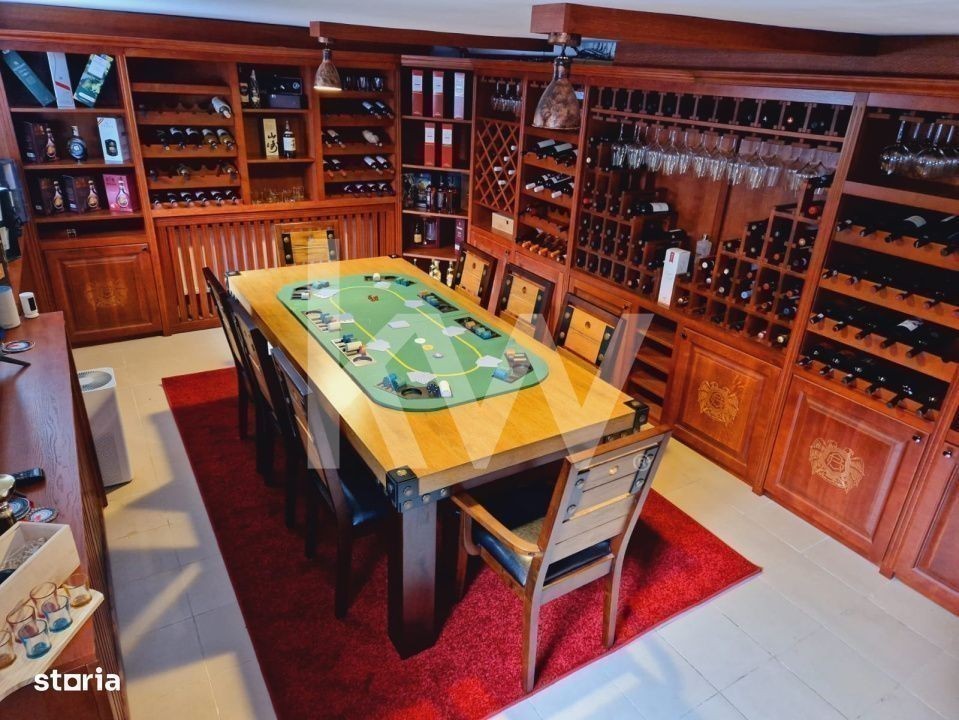 Apreciezi un stil de viață luxos, dar în același timp și liniștea naturii? Această vilă spectaculoasă este amplasată într-un cadru natural de o frumusețe rară, la doar 12 minute de mers pe jos de faimosul Castel Bran sau Castelul lui Dracula. Proprietatea, cu o suprafață construită de 800 mp și un teren de 1.834 mp, oferă intimitate absolută și confort desăvârșit. Poziționarea excepțională, la doar 6 minute de o stațiune locală de schi și 20 de minute de Poiana Brașov, asigură acces facil la atracții culturale și sportive montane, pe tot parcursul anului. Construcție & Design • Renovare completă în 2023 • Izolație profesională cu vată bazaltică • Fațadă elegantă placată cu piatră naturală • Ușă pivotantă monumentală la intrare Interiorul reflectă rafinament absolut, cu materiale naturale de înaltă calitate și finisaje personalizate: • Living cu tavan înalt de 6,5 metri și șemineu funcțional care încălzește spațiul • Zonă de dining cu masă din stejar personalizată pentru 14 persoane, ideală pentru evenimente și cine rafinate • Masă din stejar masiv de 15 ani, adusă din Georgia, realizată dintr-o singură bucată - parte dintr-un set de 3 piese • Trepte interioare din stejar masiv • Ferestre Schüco pe toată înălțimea peretelui pentru priveliști spectaculoase Compartimentare și dormitoare Parter: • Hol de intrare generos cu dulapuri built-in • Baie de serviciu cu mașină de spălat și uscător • Cămară walk-in, la o temperatură joasă • Bucătărie complet utilată cu mobilier din lemn masiv de stejar, blat granit/marmură, electrocasnice încorporate (inclusiv microunde electric, frigider), dulapuri soft-close • Cramă din lemn masiv cu frigider pentru vinuri și trabucuri, izolată fonic, chicinetă cu mașină de vase și boiler room Etaj 1: • Cameră matrimonială cu un pat dublu, baie proprie cu duș • Cameră matrimonială cu pat reglabil electric cu masaj, cadru și mobilier din lemn, baie cu bideu și duș • Cameră pentru copii: 4 paturi încorporate în pereți, dulapuri built-in, baie proprie cu duș Mansardă: • Dormitor spațios pentru oaspeți cu două paturi matrimoniale și baie proprie Divertisment & Relaxare • Sală de cinema complet echipată (ecran 4K adus din SUA, sistem audio 7.1, subwoofer, stație cu Alexa, efect „cer înstelat” cu senzor, izolație fonică, canapele pe comandă din Italia) • Masă de biliard olimpică de 9 feet, tacuri de colecție • Zonă de jocuri: ping pong, darts, șah, jocuri de masă Zona SPA și Wellness • Piscină placată cu marmură, pereți cu tencuială venețiană, lumini ascunse LED, sistem performant de refulare • Cameră de intrare în zona piscinei cu marmură, piatră naturală, lumini pe senzor • Sauna uscată (4-5 persoane) și saună umedă personalizată • Duș cu găleată cu gheață • Jacuzzi personalizat nivele variate de adâncime (capacitate testată cu 20 persoane) • Draperii electrice, candelabre custom • Geamuri alcătuite dintr-o singură bucată cu deschidere spre terasa cu vedere la râu • Posibilitate amenajare bar la piscină • Cameră tehnică dotată cu fosă ecologică, reglator de tensiune, sistem de filtrare și control pH al apei, sistem care transformă umiditatea în aer cald în sezonul rece Fitness & Funcționalitate • Sală de fitness profesională cu boxe ambientale Sonos, sunet distribuit uniform și control direct de pe telefon • Spațiu verde versatil ce poate fi amenajat ca teren de pickleball de exemplu • Scări de acces exterioare cu încălzire în pardoseală • Parcare generoasă pentru 10 autoturisme (3 locuri acoperite și 7 în curte) Exterior & Conectare cu natura • Râu care traversează discret terenul • Iaz populat cu peste 50 de pești koi • Grădini amenajate profesional cu vegetație matură • Terasă acoperită în apropierea râului - spațiu de relaxare și meditație tip „cave” • Fire pit exterior pentru seri liniștite și sociale • Zonă insulară pentru BBQ cu bar exterior Anexe și intimitate • Căsuță separată tip foișor cu birou și baie la parter, dormitor la etaj - perfectă pentru copii sau oaspeți • Acces securizat prin două porți private, conectate la drum particular • Gard natural din vegetație matură cu înălțime de 15 me