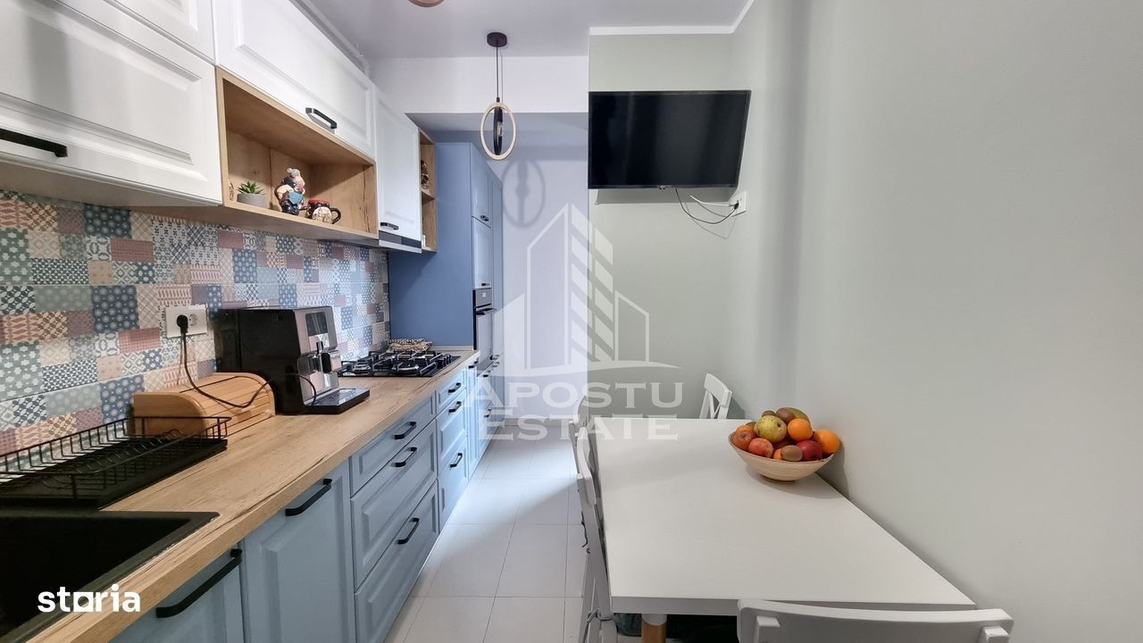 Apostu Estate va ofera spre vanzare un apartament decomandat, cu 2 camere si terasa, situat la etajul 3/7 in bloc nou cu lift (constructie 2019) din zona Aradului. Imobilul are suprafata de 57 mpu + terasa si este compartimentat astfel: - hol acces - living spatios si luminos cu acces la balcon - bucatarie complet utilata cu aragaz, hota, cuptor, frigider, masina de spalat vase si mobilata cu loc de luat masa - dormitor cu pat matrimomial si dressing incorporat - baie cu geam si cada - terasa Vecinatati: -Mijloace de transport in comun -Auchan -British School -Profi Dotari: Confortul termic este asigurat cu ajutorul centralei propii pe gaz, incalzirea in pardoseala si aparatului de aer conditionat. Apartamentul este complet mobilat si utilat precum se observa in imagini. Loc de parcare in parcarea cu bariera din fata imobilului. Va asteptam cu drag la vizionare! ID intern: CP2313710