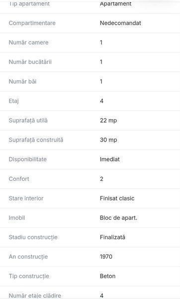 Apartamentul este situat in zona Blascovici la etajul patru avand o suprafata utila de 22 mp.Dispune de o camera,baie cu dus si bucatarie.Este finisat complet avand gresie si faianta in baie si bucatarie,parchet laminat in camera,geamuri termopan si aparat de aer conditionat. Peretii apartamentului sunt izolati. Se vinde mobilat si utilat complet.