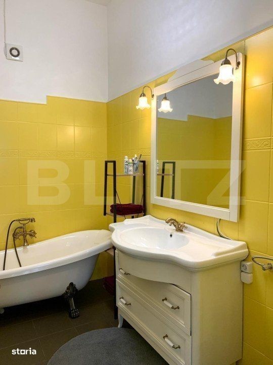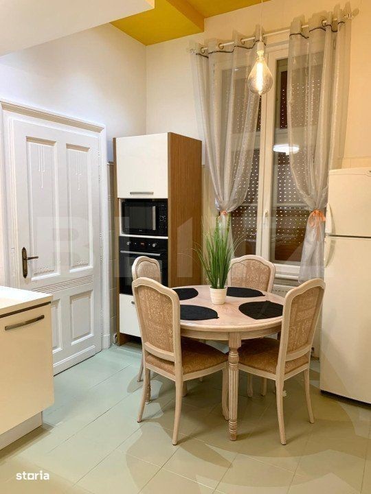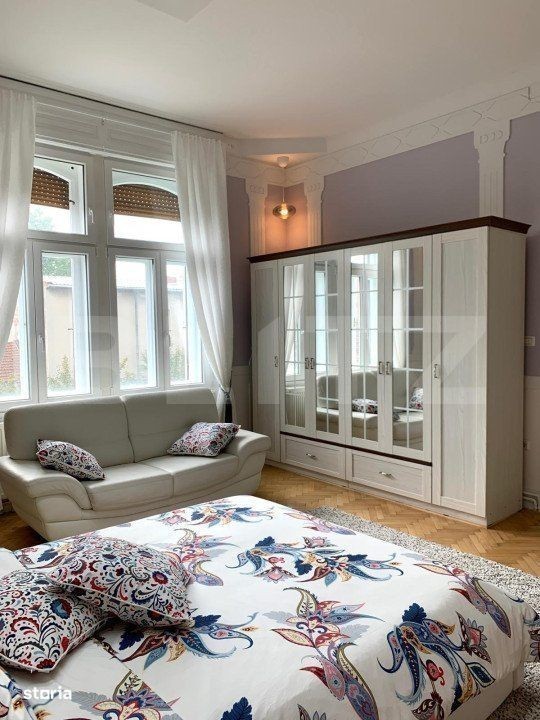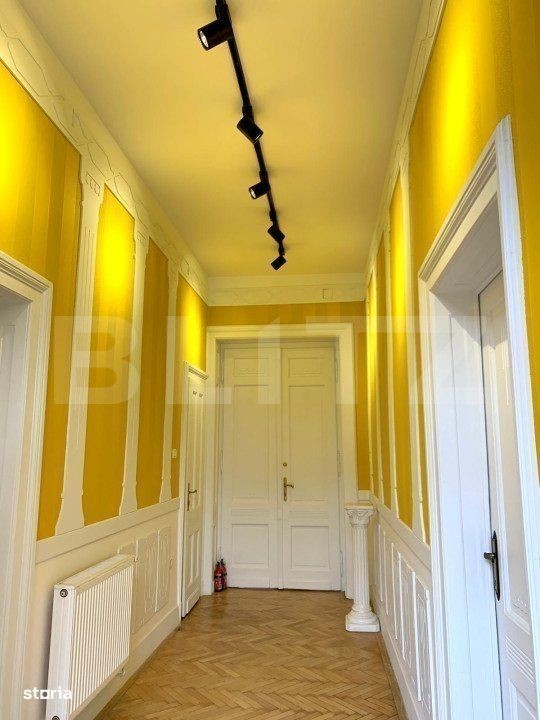 BLITZ vă propune spre vânzare un apartament de lux, cu 4 camere, situat la etajul 2 al unui imobil cu 2 etaje intr-o cladire istorica, din zona Sinaia, foarte aproape de centru. Cladirea are intrare securizata, in bloc sunt cabinete de doctori pe o scara foarte frumoasa si linistita. Suprafata este de 134 mp utili iar compartimentarea este semidecomandată dispusă astfel: 1 hol generos la intrare, 1 living spațios (salon), 2 dormitoare, 1 birou, 1 bucătărie, 3 bai (una cu cada, cealalta dotata cu dus si o toaleta de servici), camera de depozitare și 2 pivnite la demisol inscrise in CF. Sobele de teracota din ceramica in numar de 3, ca piese de decor te duce cu gandul in vremurile demult apuse. Respectand autenticitatea, apartamentul se vinde mobilat intr-o forma moderna, acest lucru fiind realizat cu un arhitect decorator francez. Pardoseala din lemn masiv, reconditionat Centrala proprie pe gaz si 2 aparate de aer conditionat noi. Curte comuna cu locatarii imobilului. Va asteptam cu drag la vizionare!