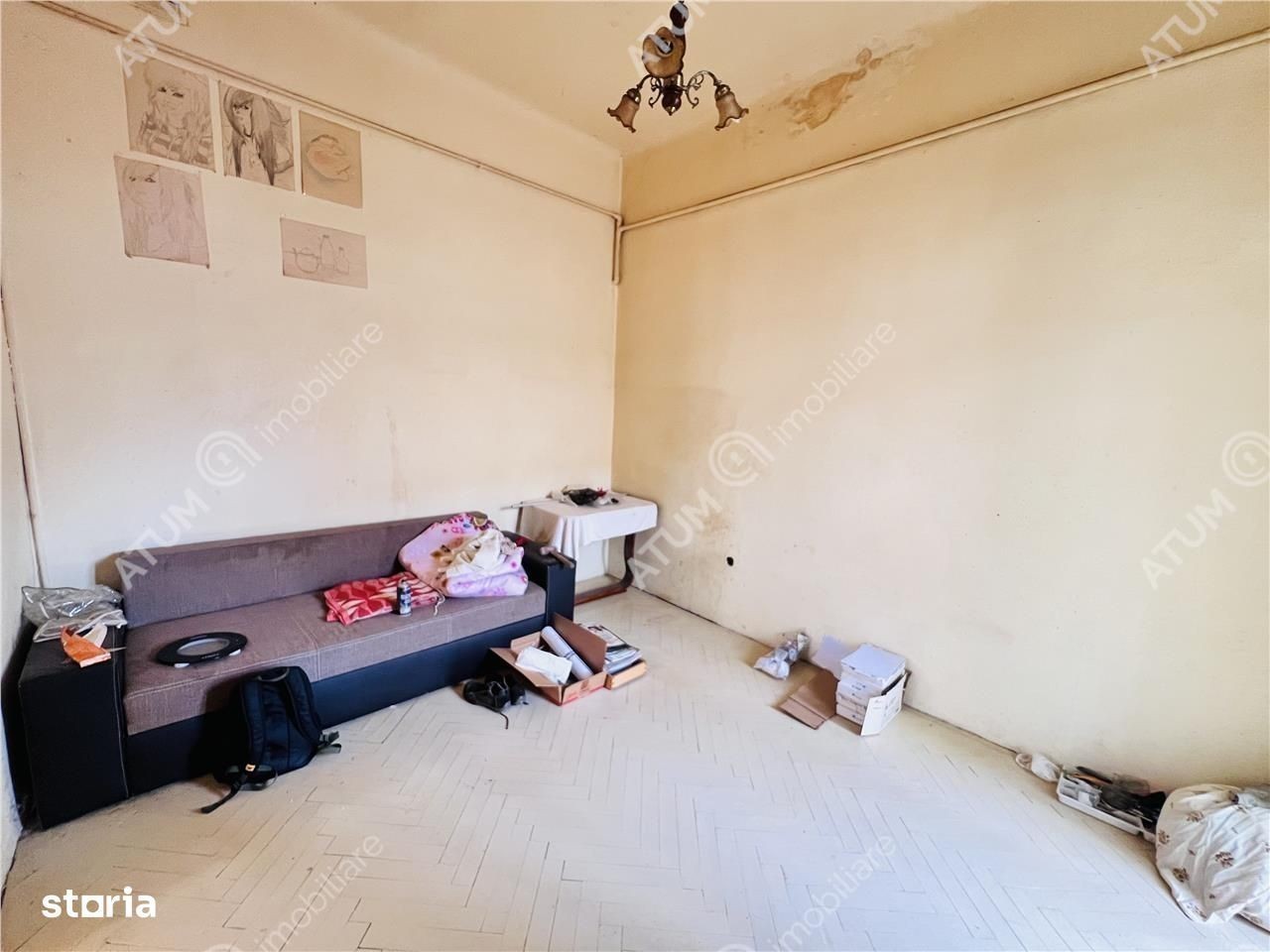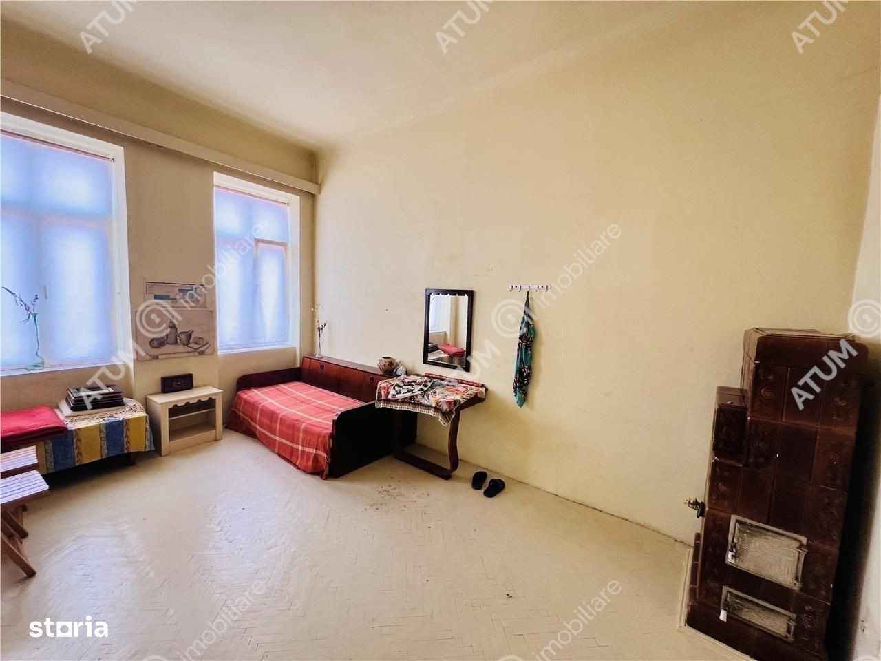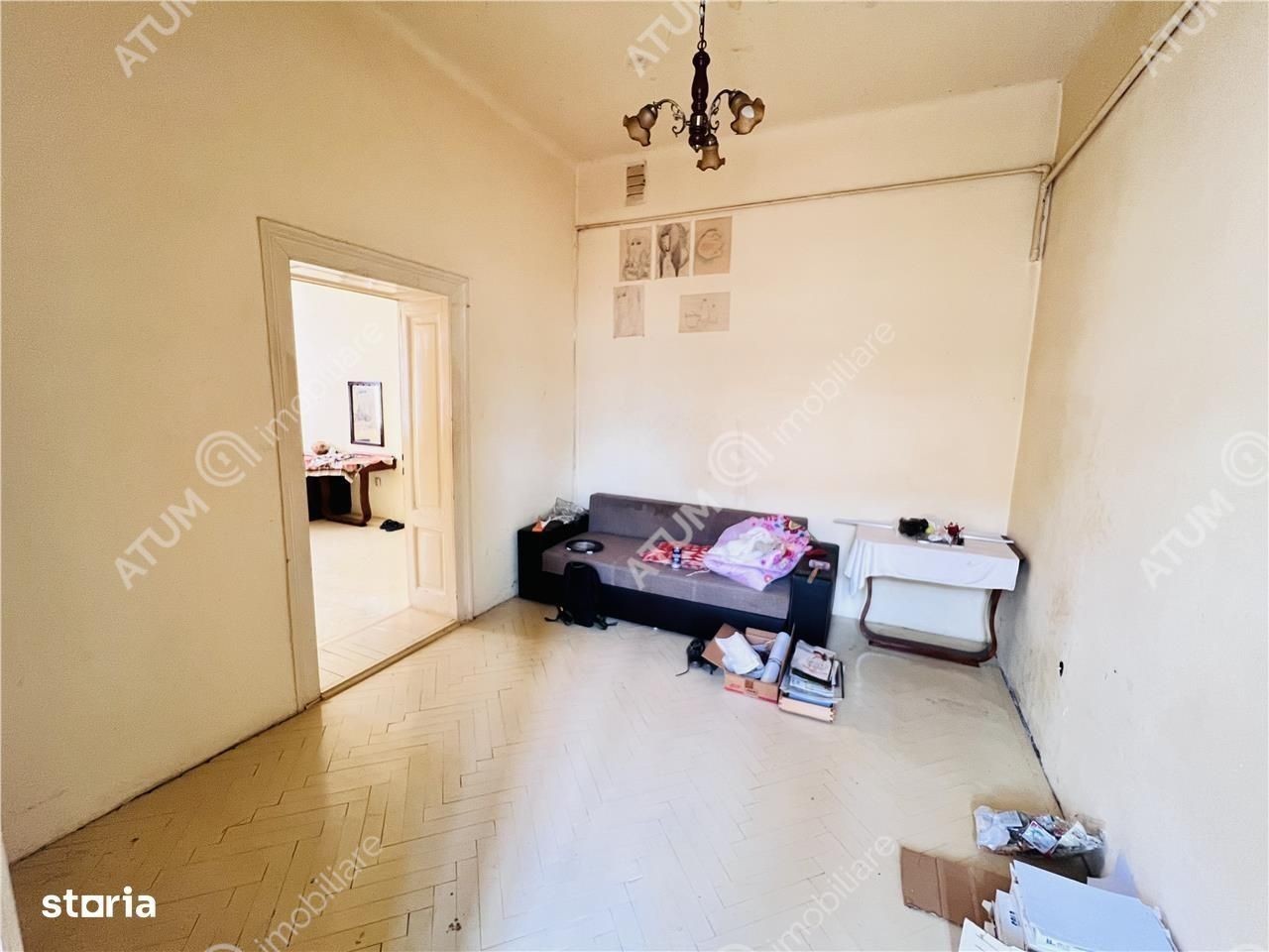 Va prezentam un apartament spatios compus din 3 camere, situat la etajul 1 al unei case solide, aflata intr-una dintre cele mai cautate si valoroase zone ale Sibiului, la doar cativa pasi de centrul istoric, Piata Mare. Locuinta beneficiaza de 74 mp utiliti, compusi din 3 camere, bucatarie, baie si hol. Separat de suprafata utila proprietatea mai detine o pivnita la subsolul imobilului si o debara. Proprietatea se remarca printr-o compartimentare practica, ce asigura o functionalitate excelenta a fiecarui spatiu si prin luminozitatea naturala ce pune in valoare camerele generoase si inalte. Fiecare incapere beneficiaza de ferestre largi, care contribuie la o atmosfera calda si luminozitate naturala. Finisajele existente, precum parchetul din lemn masiv, care adauga un plus de autenticitate si rafinament, alaturi de tamplaria PVC cu geamuri termopan si lemn. Locuinta necesita renovare, insa acest aspect ofera un avantaj semnificativ, posibilitatea de a fi amenajata complet dupa bunul plac si nevoile individuale. Viitorul proprietar are libertatea de a valorifica potentialul apartamentului si de a imbina armonios farmecul clasic al constructiei cu elemente moderne de confort si design. Amplasarea in zona ultracentrala, cu acces imediat catre principalele obiective istorice si culturale, este o oportunitate unica atat pentru locuire, cat si pentru investitie in regim hotelier, aducand un venit pasiv. Valoarea de achizitie a apartamentului este de 162.000 euro. ID intern: 2808.