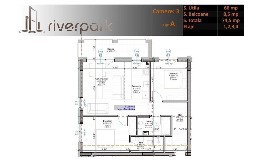 Ofera-ti luxul de a locui intr-un apartament modern Ansamblul rezidential River Park Reghin se va dezvolta pe strada Raului nr. 16, pe malul raului Mures, intr-o zona retrasa, dar totusi foarte aproape de toate punctele de interes. Cu 3 camere avem urmatoarele variante: -tip A: 66mp util + 8,5mp balcon = 74,5mp total, la etajele P-2, pret incepand de la 77000 + TVA, ultimul in blocul 7, sau variante in blocul 8! -tip B: 69 mp util + 10 mp balcon = 79 mp total - ultimul disponibil in blocul 7, sau in blocul 8, preturi incepand de la 83000 euro + TVA Toate apartamentele vin cu incalzire in pardoseala si centrala proprie in condensare incluse. (la cerere se pot face si cu incalzire prin calorifere). Daca doriti un apartament mai deosebit, avem si apartamente tip PENTHOUSE. Pentru detalii suplimentare, sau daca doriti sa va programati o vizita pe santier va stam la dipozitie. nota* preturile mentionate sunt pentru apartamentele semifinisate, insa exista posilitatea de finisare contra unui cost suplimentar. Preturile NU includ TVA ! In privinta TVA se poate aplica taxare inversa (pentru firme platitioare de TVA) sau 21% pentru PF