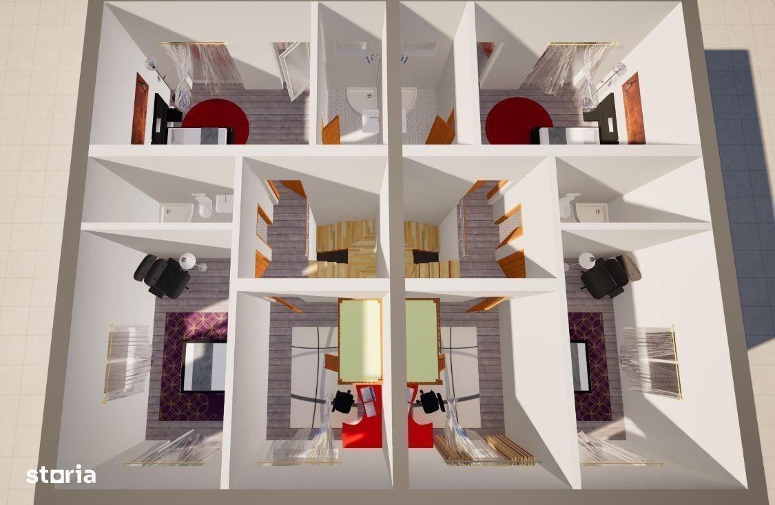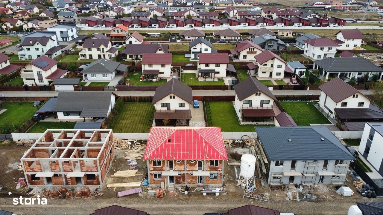 Locație excelentă, zona în dezvoltare, liniștită și aerisită Termen de finalizare estimat: Martie 2026 Preț: 155.000 € Compartimentare modernă pe două niveluri - Ap. 2 Parter: • Living generos - 34,62 mp • Bucătărie separată - 10,18 mp • Baie 1 - 5,33 mp • Hol - 4,94 mp • Spațiu tehnic sub scară / depozitare • Casă scării - 5,94 mp Etaj: • Dormitor 1 - 14,95 mp • Dormitor 2 - 11,04 mp • Dormitor 3 - 15,33 mp • Baie 2 - 4,48 mp • Baie 3 - 5,03 mp • Holuri - 3,32 mp și 7,81 mp • Două balcoane: 2,00 mp și 2,80 mp Dotări și finisaje incluse în preț: • Racordate la toate utilitățile • Încălzire în pardoseală + centrală termică inclusă • Gard din șipcă metalică inclus • Buget finisaje: 70 lei/mp pentru gresie, parchet și faianță 7500 lei pentru 3 băi (cadă, duș, WC, bideu, lavoare) 800 lei/ ușă pentru uși interioare Contact: