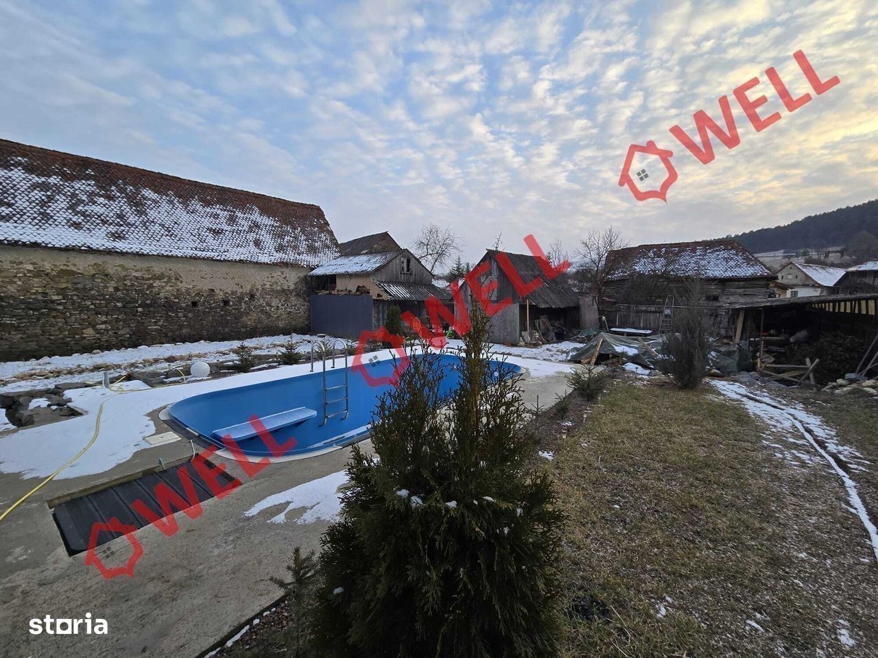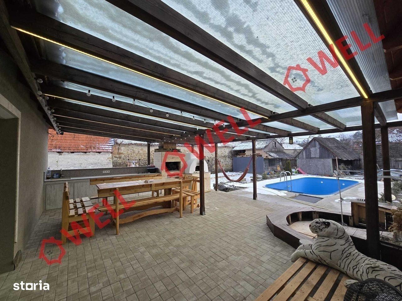 Casa a fost construită ca o casă inteligentă, iar cablurile corespunzătoare sunt integrate, este izolată la exterior (5 cm), și este dotată cu ferestre termoisolante. Imobilul conține: 3 dormitoare, 2 băi (dintre care una este dotată cu duș cu hidromasaj), living mare + bucătărie deschisă (aici cu încălzire prin pardoseală completă), cameră pentru servere. Casa dispune de pivniță, terasă deschisă de 50 mp cu bucătărie exterioară, cuptor și grătar.Încălzirea este asigurată de un cazan electric respectiv unul pe lemne. Sistemul de încălzire include un rezervor tampon de 500 de litri. Casa dispune de electricitate, apă curentă din fântână, care este echipată cu un sistem de control inteligent, și fosă septică. În grădină se află și o piscină încălzită de 6*3 m, cu adâncimea de 1,5 m. Pe teren se află și anexe, garaj, cameră pentru cazan, toaletă exterioară. Apartamentul se vinde complet mobilat, cu excepția sistemelor electrice.
