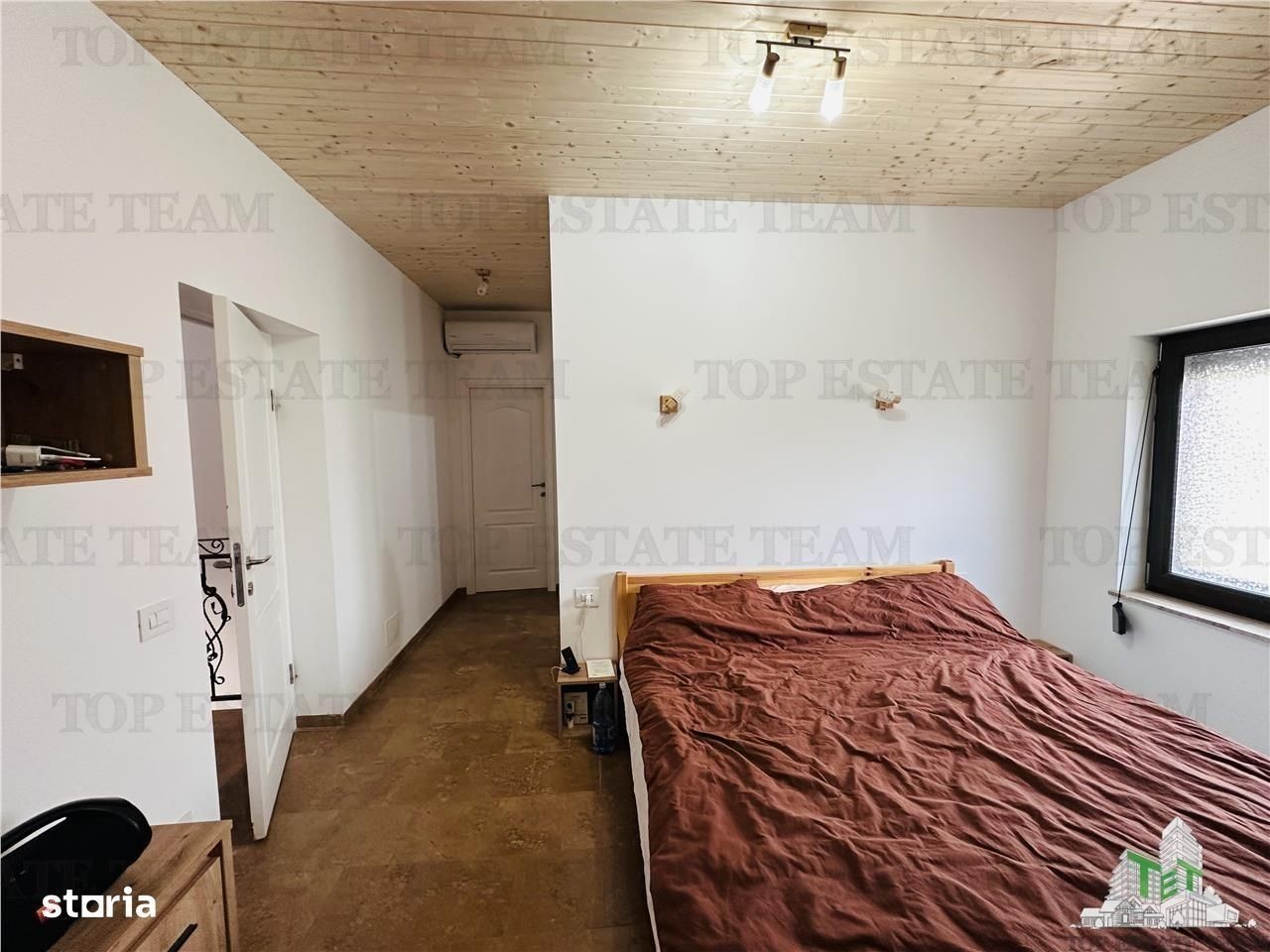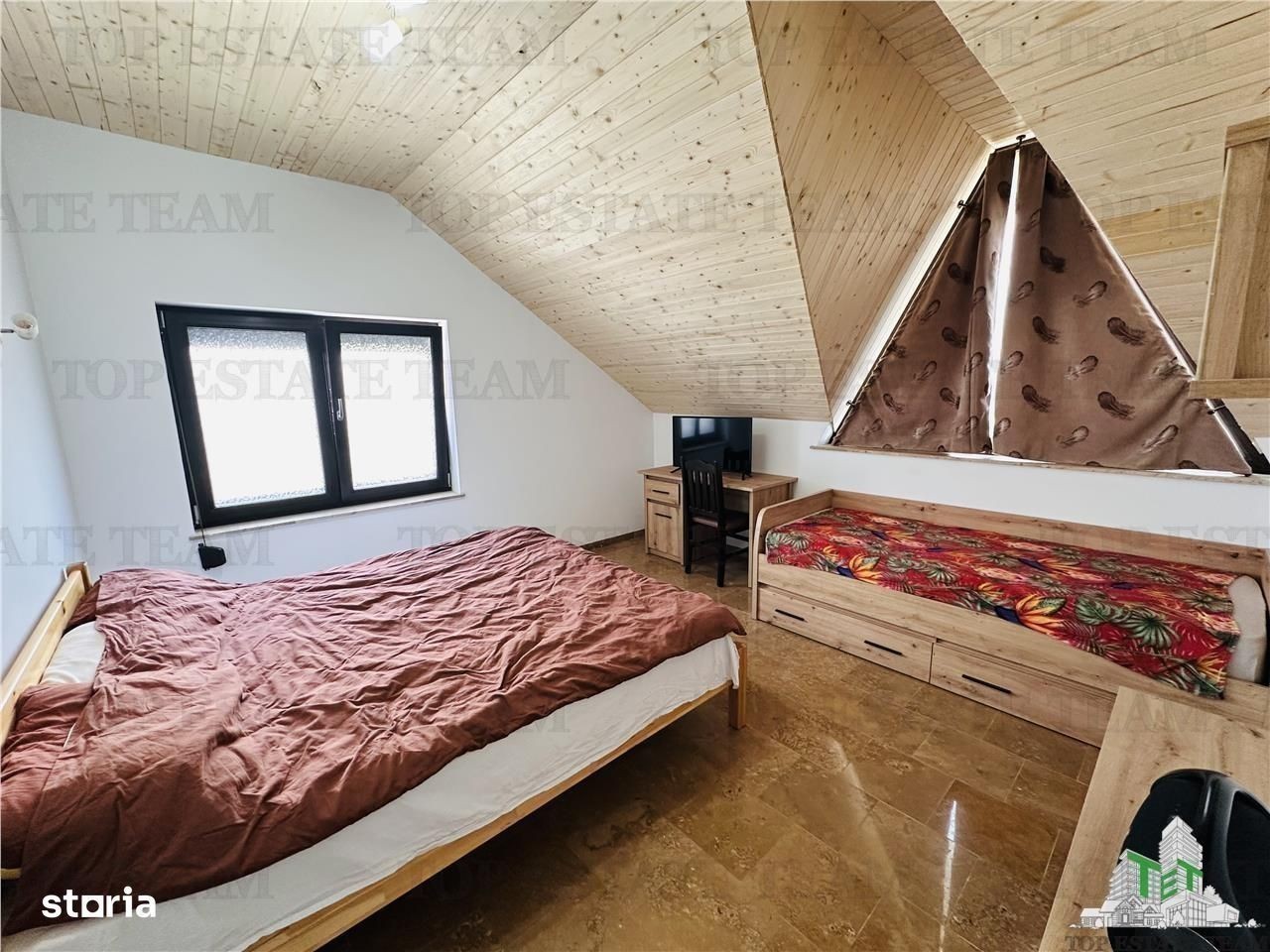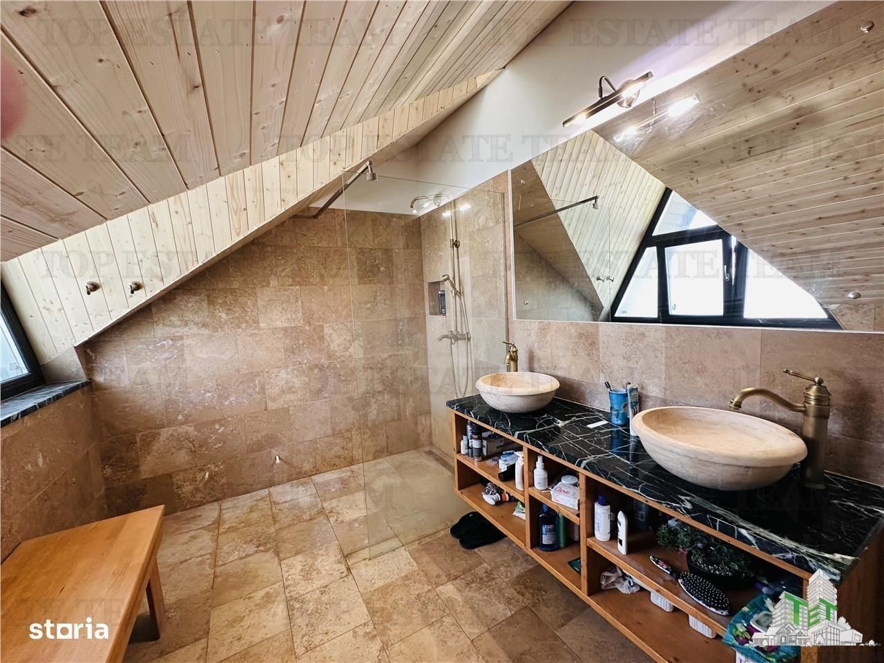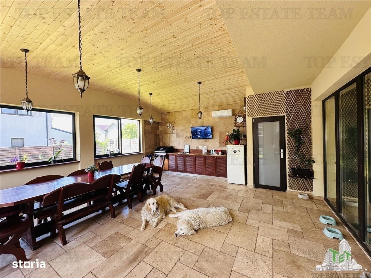 Excelenta prin experienta! Va propunem spre vanzare o vila exclusivista, individuala, parter + etaj + mansarda, 5 camere, de 195 mp utili, 300 mp construiti, cu un teren de 523 mp, situata in CHIAJNA, accesul la vila se face pe un drum privat cu bariera. Structura de rezistenta a vilei este realizata din fundatie, stalpi, grinzi si placa de beton armat. Casa este realizata din caramida Porotherm cu grosime de 25 cm, izolatia exterioara este realizata din POLISTIREN de 10 cm, tamplaria este Salamander Blue Evolution, cu geam tripan 7 camere, acoperișul este din tabla tip Lindab. Amprenta vilei este de 130 mp, terenul liber de constructie, ce este amenajat gradina cu aspersoare automate este de 393 mp, deschiderea la strada este de 29 m. Drept compartimentare optimizata, dispune la parter de un spatiu de 77 mp ce este folosit ca si garaj cu 2 porti de acces automate si o terasa inchisa de 46 mp, un grup sanitar, la etaj gasim un living spatios si luminos de 40 mp, cu o zona de dining, o bucatarie open space mobilata si utilata, si o baie superba. La mansarda dispune de 2 dormitoare cu o baie comuna, si un dressing. Bucataria este utilata cu hota, plita,cuptor, frigider, masina de spalat vase. Vila dispune de curent, gaz,apa,canal. Curtea este extrem de spatioasa, amenajata perfect pentru relaxare, o adevarata oaza de liniste si aer curat, o gradina superba cu aspersoare automate, cu o terasa superba inchisa PUNCTE FORTE IN ZONA: locatie deosebita cu vecini de calitate, liniste, se pot face plimbari in padure sau pe marginea lacului, exista gradinita, scoala, supermarket, restaurante in zona, accesul la vila se face pe o strada privata cu bariere la ambele capete Vila se vinde la pretul de 258000 EURO la care nu se adauga tva, usor discutabil. Oferim consultanta gratuita si facilitarea obtinerii rapide a creditului ipotecar, cu dobanda foarte buna si rate fixe pe 5 ani, fara costuri ascunse. Oferta apartine agentiei Top Estate Team ! Tranzactioneaza cu noi si primul transport de mobila este gratuit, in Bucuresti si Ilfov !