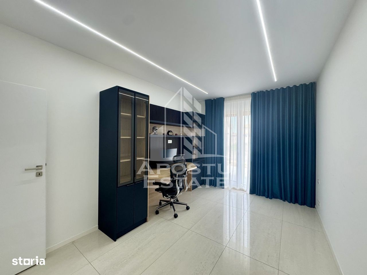 Din portofoliul exclusiv al companiei Apostu Estate, va prezentam cu deosebita placere o jumatate de duplex modern dedicata iubitorilor de rafinament, situata intr-o zona rezidentiala linistita si selecta din Dumbravita. Cu o suprafata utila generoasa de 136 mp, aceasta locuinta impresioneaza prin arhitectura contemporana, finisajele premium si compartimentarea inteligenta: Compartimentare: Parter: Hol de acces primitor; Living spatios, luminos, cu acces direct pe terasa ideala pentru momente de relaxare; Bucatarie inchisa, complet echipata, ce imbina functionalitatea cu eleganta; Birou/dormitor versatil, ideal pentru lucrul de acasa sau oaspeti; Baie moderna, cu finisaje de calitate. Etaj: Dormitor matrimonial generos, cu baie proprie, dressing si acces la terasa privata; Doua dormitoare secundare, fiecare cu iesire pe terasa comuna; Baie spatioasa, complet utilata; Hol de acces. Dotari si facilitati: Feronerie premium: geamuri tripan Salamander cu 7 camere si rulouri electrice incastrate; Gresie de designer Tempini - eleganta la fiecare pas; Incalzire in pardoseala pentru un confort termic desavarsit; Instalatie electrica trifazica; 3 aparate de aer conditionat pentru climat optim in orice sezon; 3 locuri de parcare private; Sistem de supraveghere performant cu 5 camere Hikvision color; Sistem dedurizator pentru apa curata si sanatoasa; Termostate individuale in fiecare camera - control total al temperaturii. Mobilier si electrocasnice: Proprietatea se vinde complet mobilata si utilata, cu piese de mobilier si electrocasnice atent selectionate, de o calitate superioara, menite sa reziste testului timpului si sa ofere un stil de viata confortabil si elegant. Consultanta si finantare: Oferim consultanta imobiliara completa si solutii de finantare personalizate, prin partenerii nostri de incredere. Va invitam cu drag la o vizionare pentru a descoperi personal farmecul acestei proprietati de exceptie - o locuinta ce imbina armonios luxul, functionalitatea si linistea unei comunitati selecte. CP2663289