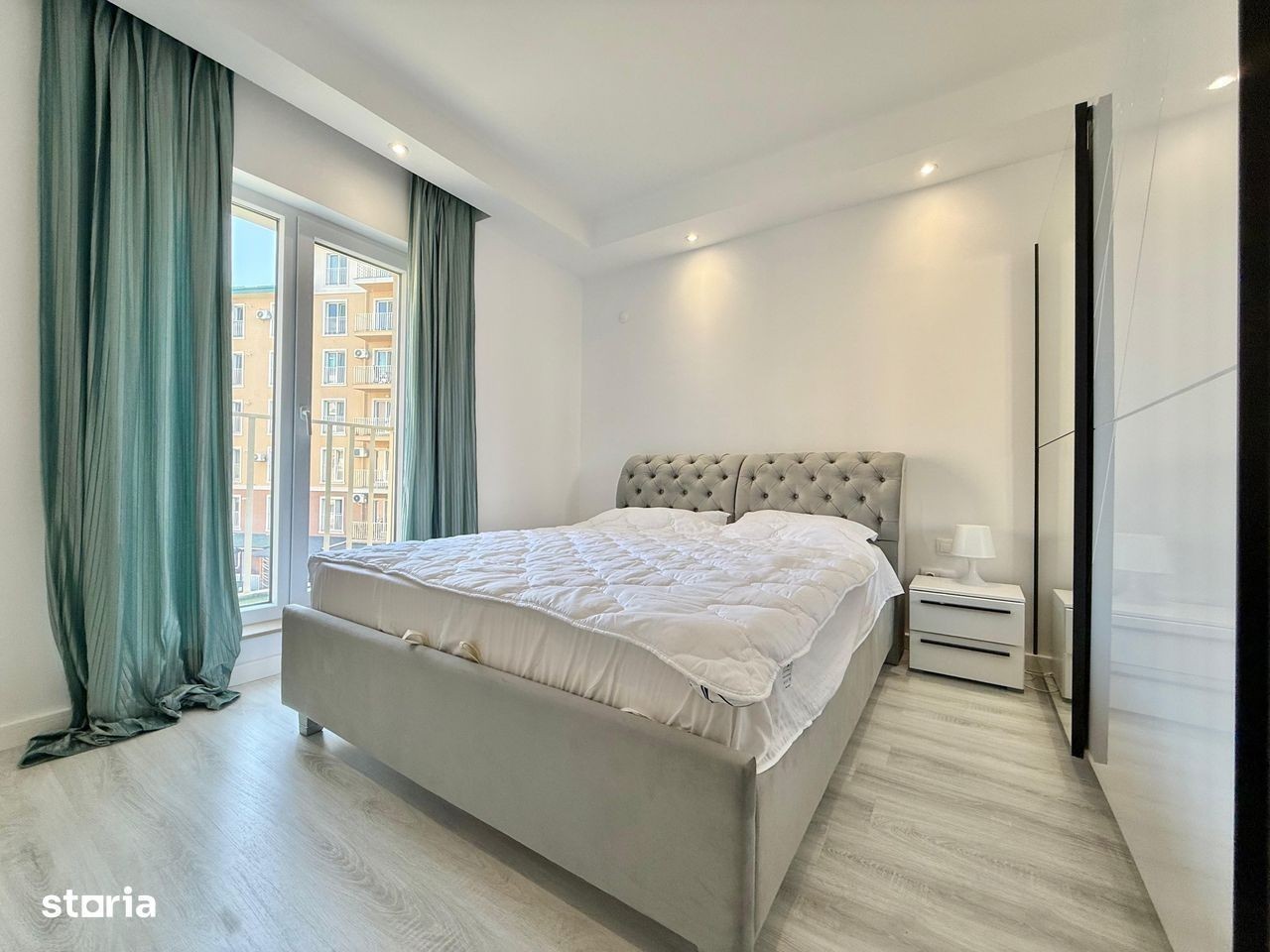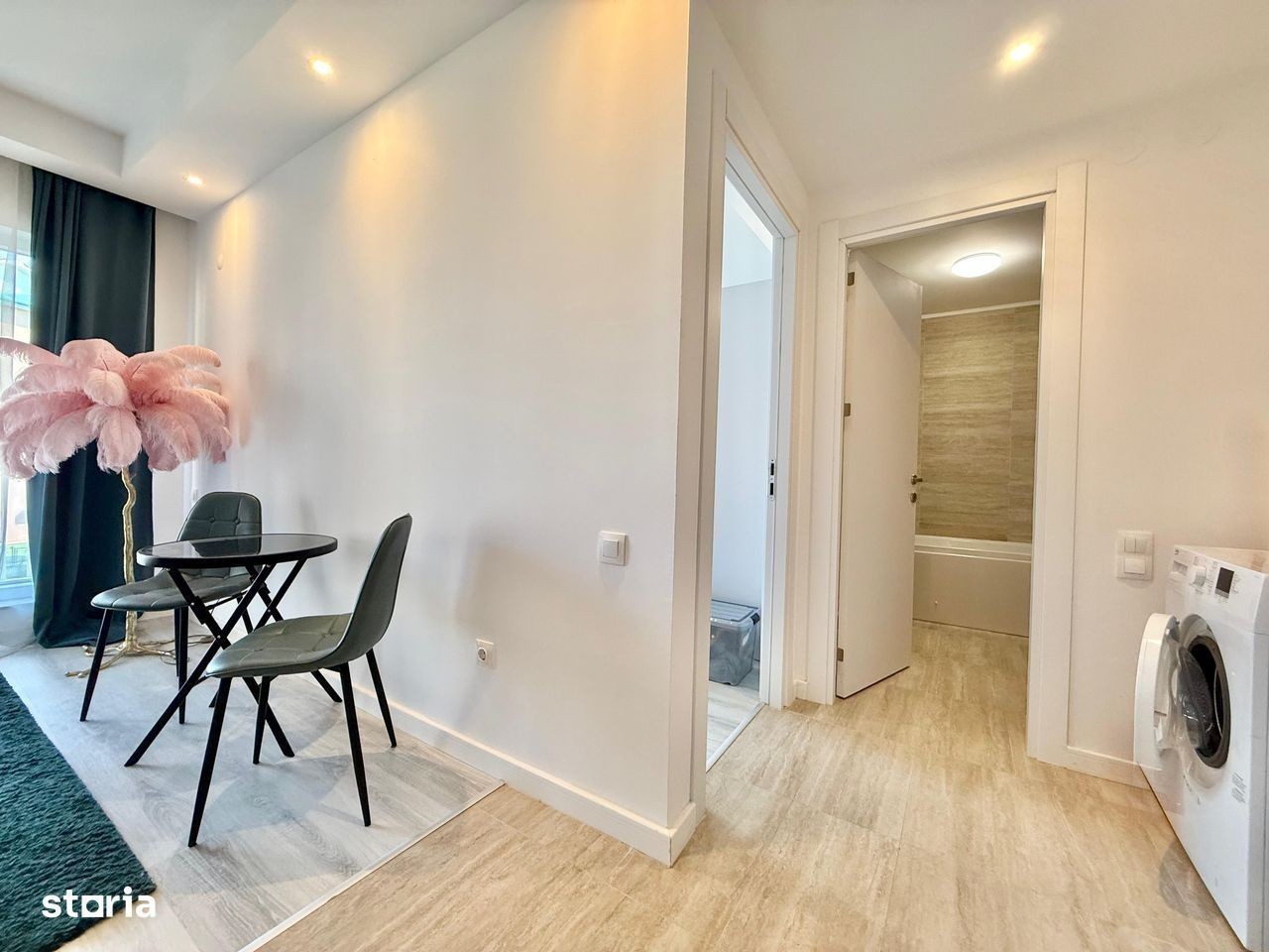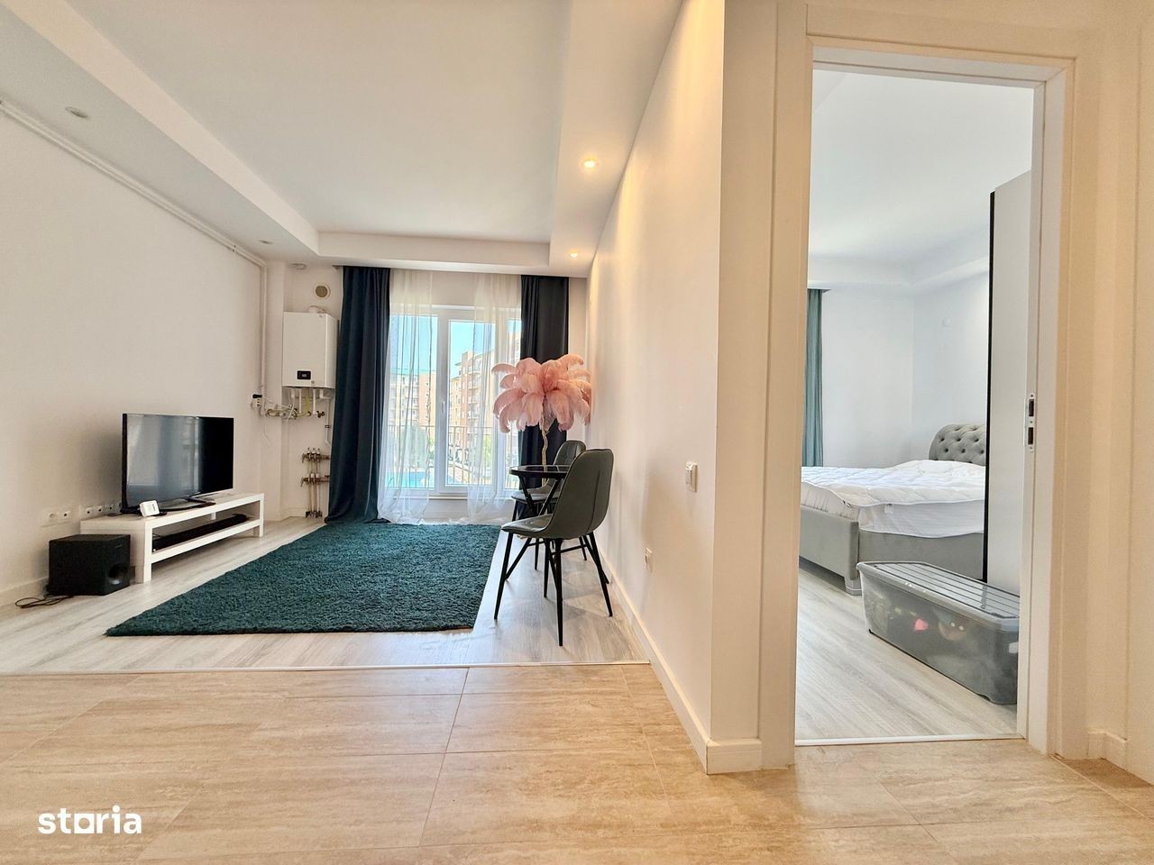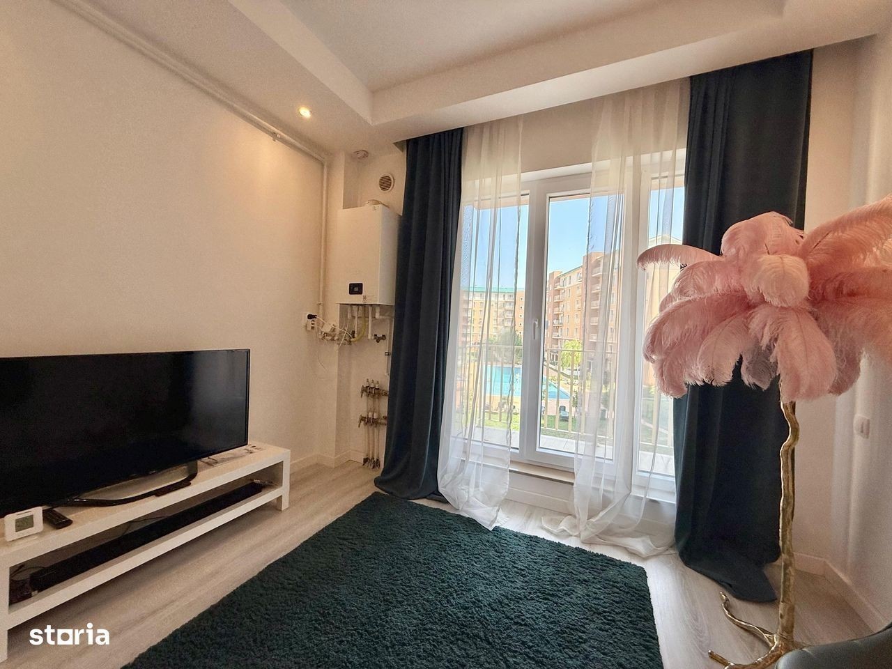 Va propunem spre vanzare un apartament de 2 camere tip studio, cu vedere spre piscina, in Complexul Rezidential Cosmopolis. Blocul este finalizat in anul 2021, constructia fiind din caramida porotherm de 30 cm si izolatie de 10 cm. Apartamentul are centrala proprie si incalzire in pardoseala.