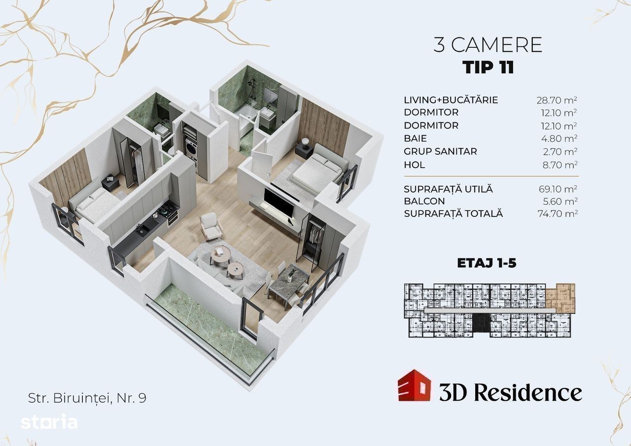 Vânzare apartament 3 camere - 74,7 mp, aprox. 14-20 minute de Metrou Berceni Se oferă spre vânzare un apartament de 3 camere, cu o suprafață utilă de 74,7 mp, situat într-un imobil modern cu regim de înălțime P+5.