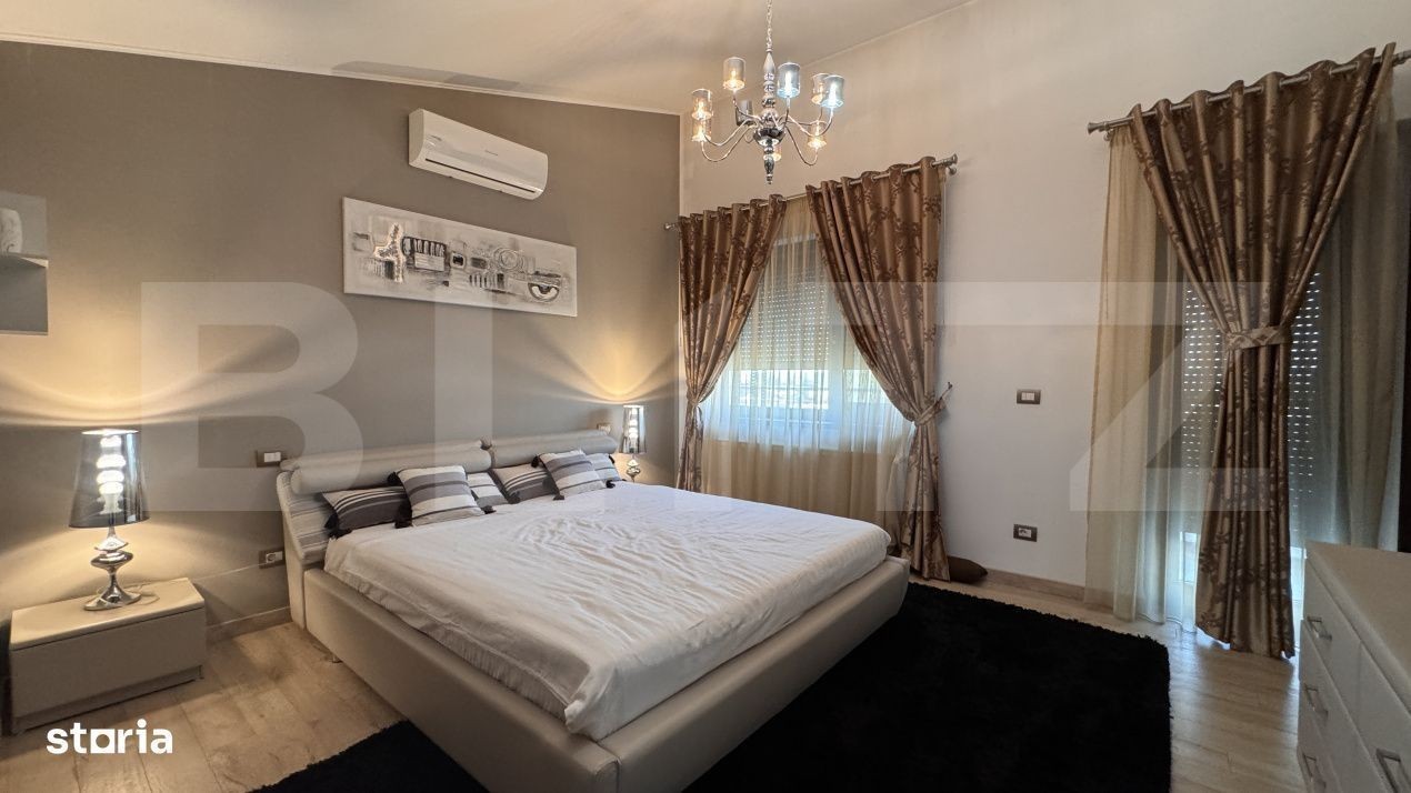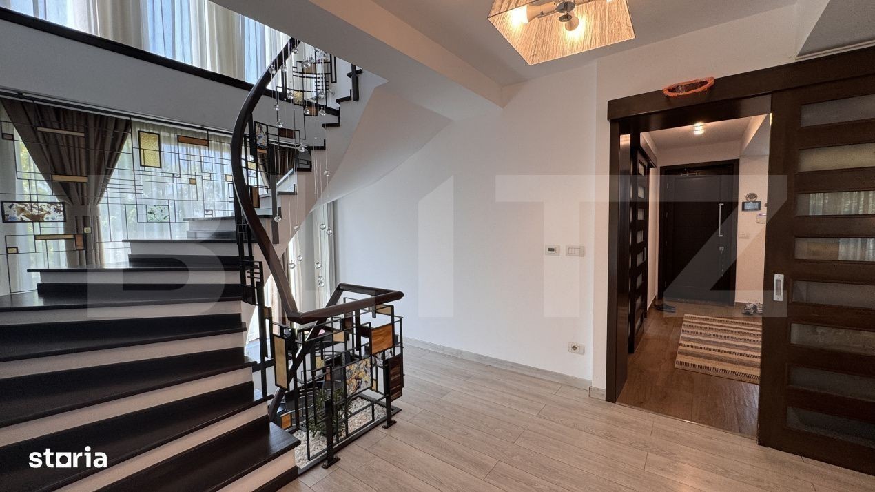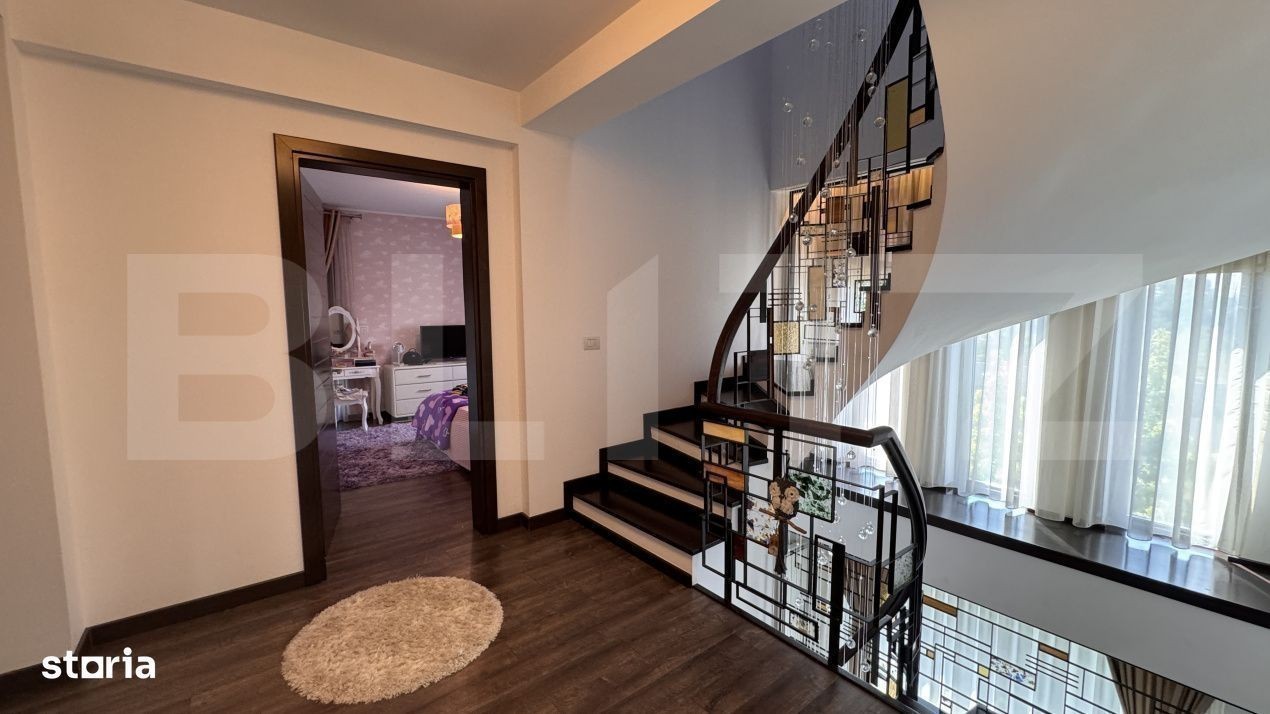 BLITZ propune spre vânzare o casă deosebită, cu regim de înălțime S + P + 2E, o suprafață utilă de 353 mp, ridicată pe un teren de 1.307 mp, din inima cartierului Veteranilor. Casa a fost construită în 2013 din BCA portant și folosind doar materiale de cea mai bună calitate, cu finisaje de top, spații bine gândite și racaordată la toate utilitățile, sistemul de încălzire fiind compus din 2 centrale de 35 kw în condensație pe gaz. Totodată, imobilul beneficiază și de un kit de panouri fotovoltaice care acoperă cea mai mare parte din consumul de energie electrică. Compartimentarea casei este una foarte practică, asigurându-se, totodată, un confort sporit, după cum urmează: - Subsol = garaj cu loc pentru 2 mașini și priză electrică de încărcare, casa scării și hol de unde se acceseaxză un spațiu depozitare/o cămară și camera tehnică - Parter = hol intrare, dressing, baie, bucătărie și un open space generos cu dinning și living, de unde se face trecerea spre curtea din spate a casei printr-o terasă acoperită - Etajul 1 = 3 dormitoare, din care unul matrimonial cu dressing, baie și balcon, o a doua baie și al doilea balcon pentru celelalte 2 dormitoare - Etaj 2 = loc de joacă open space, cu birouri și un dormitor pentru oaspeți, cu acces direct la o baie, ce se poate accesa și dintr-un hol din open space, care mai oferă acces la un dressing; dormitorul are acces și la un balcon cu vedere spre curtea din față, iar birourile la al doilea balcon ce dă spre curtea din spate Un element special al casei, o adevărată piesă arhitecturală unicat, îl reprezintă scara de tip elicoidal, cu mână curentă și trepte îmbrăcate în lemn, balustradă din fier forjat și sticlă colorată, cu candelabru ce coboară de la etajul 2 până la parter; costul acestei scări lucrate și montate manual pe poziție a fost de 40.000 euro. Pe lângă casa deosebită, cel de-al doilea beneficiu principal al acestei proprietăți îl reprezintă curtea mai mult decât generoasă, superb amenajată și foarte bine accesorizată. În partea din față avem poarta automată pentru acces auto situată în fața intrării în garaj, pavele, gazon, tuia, copaci, pietre și plante ornamentale, un mic iaz cu pești, două fântânițe, un coș de baschet, supraveghere video și sistem de iluminat. În partea din spate, pe lângă alte plante, gazon, copaci și o alee pietruită și placată regăsim un foișor ce poate fi folosit tot timpul anului, cu șemineu, sistem audio - video și o zonă de gătit în față super accesorizată ce cuprinde un grătar zidit, unul de tablă și o sobă cu plită, pentru a putea pregăti mese minunate pentru prieteni și familie atât în stil modern, cât și clasic, ca la bunica acasă; tot aici regăsim o căsuță pe post de magazie de unelte, un loc de joacă pentru copii cu spațiu pentru piscină și o zonă de terasă lângă, iar în spate de tot o livadă de pomi fructiferi. Imobilul se accesează ușor și se află într-o zonă mai retrasă bucurându-se de intimitate și puțini vecini. Apropierea de parcul Romanescu și poziția într-unul din cele mai căutate și dezvoltate cartiere din Craiova, calitatea construcției mobilată și utilată complert și modern, finisajele premium, curtea mai mult decât generoasă, superb amenajată și întreținută, împreună cu zonele de relaxare bine gândite și accesorizate sunt tot atâtea motive pentru a înțelege că suntem în fața unei proprietăți cu adevărat deosebite. Totul a fost realizat pentru confortul personal, nu pentru vânzare, vă aștept cu drag la vizionare pentru a vă convinge. Imobilul este deținut de o firmă drept urmare la prețul afișat se adaugă TVA.
