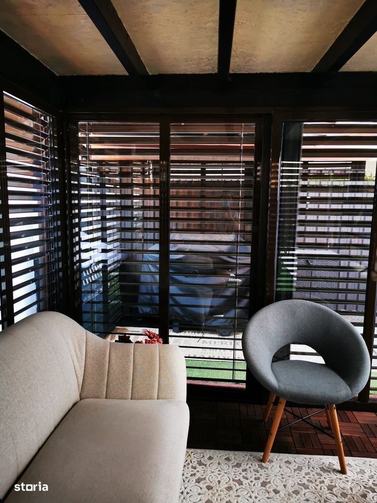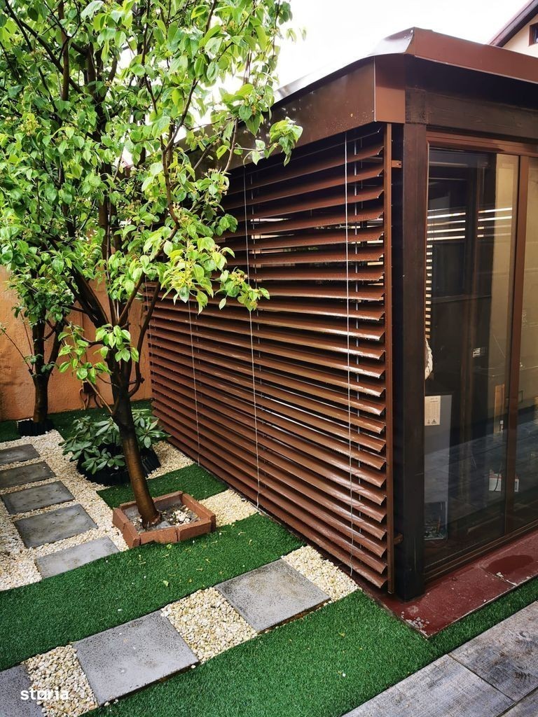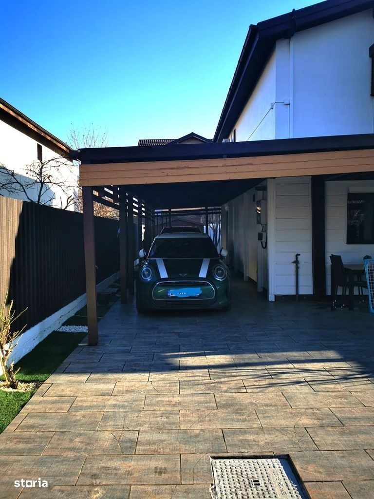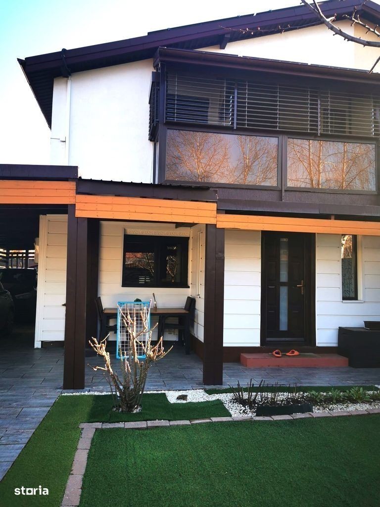 Casa de vanzare in Domnesti - Ilfov mobilata si utilata, compusa din parte si etaj cu multiple imbunatatiri. Casa are o suprafata de 110 MP utili si este compusa din: hol intrare, bucatarie inchisa, living si baie la parter, iar la etaj sunt 3 dormitoare si o baie. Dotari: 2 aere conditionate, balcon inchis termopan si cu jaluzele exterioare orizontale actionate electric; storuri exterioare la toate geamurile; panouri solare 6 KW; terasa de 9 MP inchisa cu jaluzele exterioare orizontale actionate electric; loc gratar amenajat; carport pentru 2 masini si inca un spatiu pentru a 3-a masina neacoperit; gradina cu flori si pomi fructiferi; curte 250 MP.