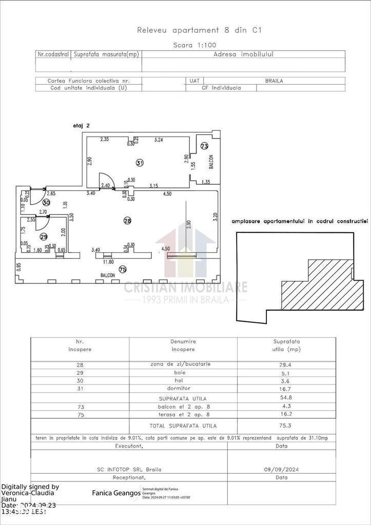 BLOC NOU 2024, ZONA EXCLUSIVISTA, * 2 camere cu suprafata totala de 76 mp * Etaj 2, OPEN SPACE * Centrala termica noua * Tamplarie interioara lemn * Termopan exterior * Balcon 4 m si teresa de 16 m * Parchet laminat in camere * Bucatarie mobilata si utilata * Faianta si gresie de actualitate * Baie prevazuta cu cabina de dus * Videointerfon VEZI VIDEO : s: shorts FgKSdt3-AxE Cristian Imobiliare - din 1993 Primii in Braila CRS7336 &11