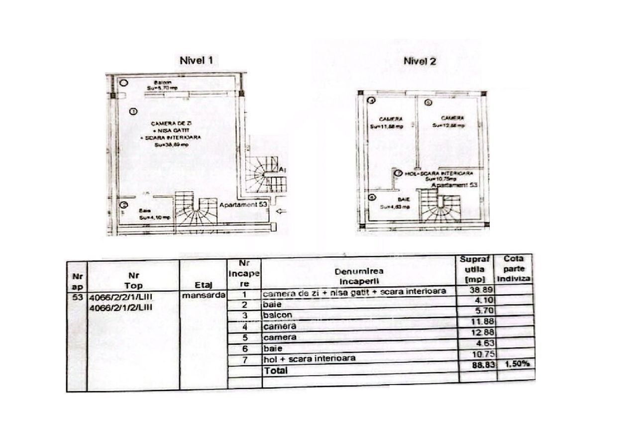 Apartament pe doua niveluri, 83mp utili, mobilat si utilat, centrala pe bloc, orientare vestica Avantaje: -constructie noua din 2005 -intabulate ambele niveluri -balcon -centrala pe bloc ( costuri de intretinere mici) -se preda mobilat si utilat -orientare vestica -mansarda inalta fara sarpanta -distanta mare intre blocuri -jaluzele din aluminiu cu izolatie in interior -exista posibilitatea sa inchiriati un loc de parcare la pretul de 140 lei pe luna -in apropiere se gaseste gradinita, Kaufland, statii de autobuz Compartimentare: Nivel 1: -hol de acces -living cu bucatarie de tip open space -baie -balcon Nivel 2: -hol -baie -2 dormitoare Locatia: Sibiu, zona Hipodrom IV ( reper strada Aleea Steaza). Iti doresti mai mult decat o simpla locuinta? Noi suntem aici pentru a-ți oferi cele mai bune soluții. Oferim servicii de DESIGN SI AMENAJARI INTERIOARE, PROPERTY MANAGEMENT, REGIM HOTELIER, HOME STAGING, VIRTUAL INVESTMENT, SERVICII DE CURATENIE.