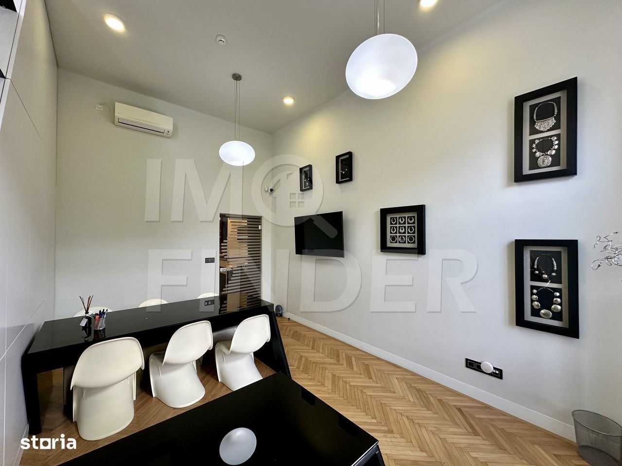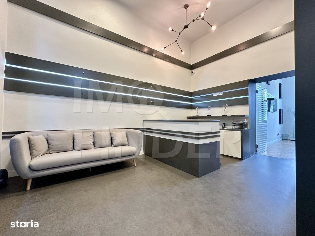 IMOFINDER iti propune spre inchiriere un spațiu de birou elegant și complet funcțional, situat la parter, chiar în inima Pieței Mihai Viteazu. Cu o suprafață de 45 mp și o înălțime impresionantă de 4 metri, acest birou oferă un mediu de lucru luminos, modern și reprezentativ. Inițial folosit ca si cabinet de avocatură, se potrivește perfect pentru firme de consultanță, IT, arhitectură sau orice business care dorește un sediu reprezentativ. Caracteristici principale: • Recepție primitoare și zonă de așteptare pentru clienți • Birou directorial și sală de ședințe cu design contemporan • Grup sanitar amenajat modern, cu finisaje de calitate • Chicinetă complet utilată pentru confortul echipei • Aer condiționat Daikin și mobilier personalizat • Finisaje premium: pardoseală din lemn, detalii moderne de design interior Puncte forte: • Pregătit pentru închiriere imediată, fără investiții suplimentare • Poziție centrală, într-o zonă bine conectată și ușor accesibilă Un spațiu care combină funcționalitatea cu eleganța, creat pentru a oferi confort și prestigiu. Ocupabil imediat