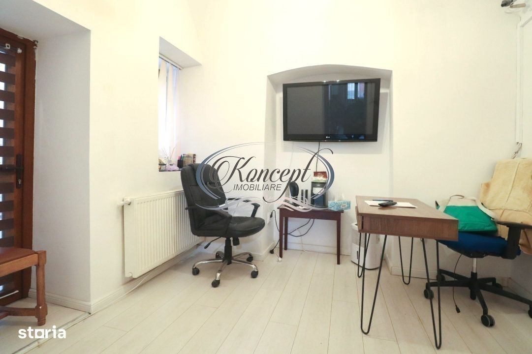 Koncept Imobiliare ofera spre inchiriere un spatiu de birouri situat ultracentral, pe strada Eroilor, una dintre cele mai cunoscute si circulate artere din Cluj-Napoca. Pozitionarea la parter intr-o vila de patrimoniu confera vizibilitate maxima si acces direct pietonal, fiind o adresa reprezentativa pentru orice tip de activitate profesionala. Spatiul are o suprafata utila de 45 mp, compartimentat in doua incaperi si un grup sanitar, cu acces la o terasa de 5 mp. Este complet functional si nu necesita recompartimentari, oferind un cadru practic si eficient. In plus, beneficiaza de o boxa mare de depozitare la subsol, utila pentru arhivare sau stocare. Biroul dispune de finisaje moderne si iluminat LED, iar incalzirea este asigurata prin centrala proprie cu calorifere. Exista mobilier disponibil la cerere, in functie de preferintele chiriasului. Sistemul de alarma si configuratia interioara asigura un plus de securitate si confort. Spatiul este pretabil pentru activitati de birouri cu sau fara public, fiind potrivit pentru domenii precum contabilitate, arhitectura, avocatura sau birouri de executori. Adresa ultracentrala reprezinta un avantaj competitiv pentru firmele care doresc vizibilitate si prestigiu. Imobilul este disponibil imediat, iar actele sunt in regula, biroul figurand in cartea funciara. Pentru informatii complete, programarea unei vizionari sau pentru a afla oferta noastra completa va stam la dispozitie telefonic, prin e-mail sau la sediul agentiei noastre, pe str. Aviator Badescu, nr. 19, Cluj-Napoca.