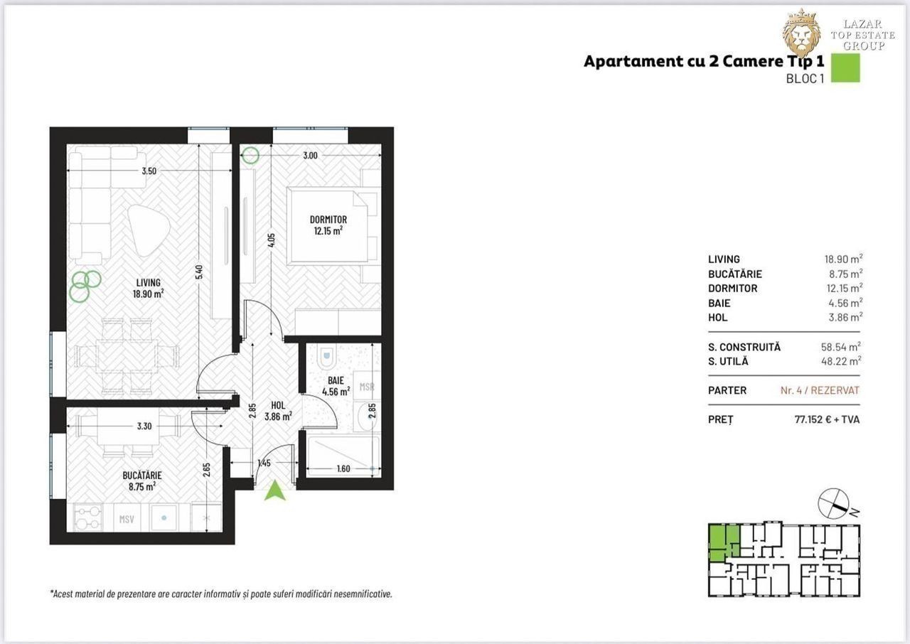 Green Park Apartments | Apartamente 2 camere | Parcare subterană inclusă | Etaje 1-3 | Finalizare septembrie 2026 Bloc 1 - Proiect rezidențial nou în fază de pre-vânzare Începere lucrări: August 2025 Finalizare estimată: Septembrie 2026 Loc de parcare subteran inclus în preț Descoperă apartamentele cu 2 camere din cadrul Green Park Apartments, fiecare cu balcon privat, compartimentare inteligentă, finisaje moderne și poziționare ideală într-o zonă liniștită, dar bine conectată la facilități urbane. Tip 1 - Apartament compact, eficient și accesibil • Suprafață utilă: 48.22 mp • Balcon: 4.80 mp • Suprafață construită: 58.54 mp • Living: 18.90 mp • Bucătărie: 8.75 mp • Dormitor: 12.15 mp • Baie: 4.56 mp • Hol: 3.86 mp • Preț: 77.152 € + TVA • Etaj: Parter Tip 2 - Dormitor spațios și zonare echilibrată • Suprafață utilă: 52.94 mp • Suprafață construită: 68.18 mp • Living: 18.20 mp • Bucătărie: 8.45 mp • Dormitor: 14.28 mp • Baie: 5.13 mp • Hol: 6.88 mp • Preț: 84.704 € + TVA • Etaj: Parter Tip 3 - Bucătărie separată și living generos • Suprafață utilă: 52.31 mp • Suprafață construită: 61.75 mp • Living: 18.20 mp • Bucătărie: 8.76 mp • Dormitor: 13.68 mp • Baie: 5.13 mp • Hol: 6.54 mp • Preț: 83.696 € + TVA • Etaj: Parter Tip 4 - Apartament luminos cu balcon privat • Suprafață utilă: 48.22 mp • Balcon: 4.80 mp • Suprafață construită: 58.54 mp • Living: 18.90 mp • Bucătărie: 8.75 mp • Dormitor: 12.15 mp • Baie: 4.56 mp • Hol: 3.86 mp • Preț: 84.832 € + TVA • Etaje: 1, 2, 3 Tip 5 - Cel mai spațios apartament cu balcon • Suprafață utilă: 52.94 mp • Balcon: 4.20 mp • Suprafață construită: 68.18 mp • Living: 18.20 mp • Bucătărie: 8.45 mp • Dormitor: 14.28 mp • Baie: 5.13 mp • Hol: 6.88 mp • Preț: 91.424 € + TVA • Etaj: 3 (Nr. 28) Tip 6 - Apartament cu balcon mare și compartimentare ideală • Suprafață utilă: 52.31 mp • Balcon: 4.68 mp • Suprafață construită: 61.75 mp • Living: 18.20 mp • Bucătărie: 8.76 mp • Dormitor: 13.68 mp • Baie: 5.13 mp • Hol: 6.54 mp • Preț: 91.184 € + TVA • Etaje: 2, 3 Avantaje incluse: • Parcare subterană inclusă în preț • Lift modern pe fiecare nivel • Finisaje de calitate superioară • Zonă liniștită, cu acces rapid către facilități urbane • Ideal pentru locuință proprie sau investiție Contactează-ne pentru prezentare detaliată și rezervări: