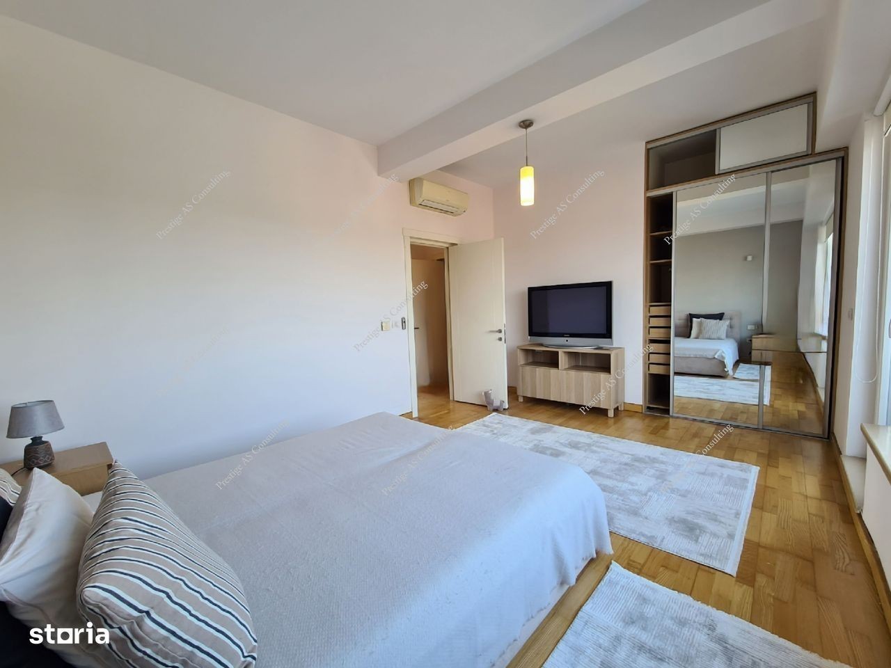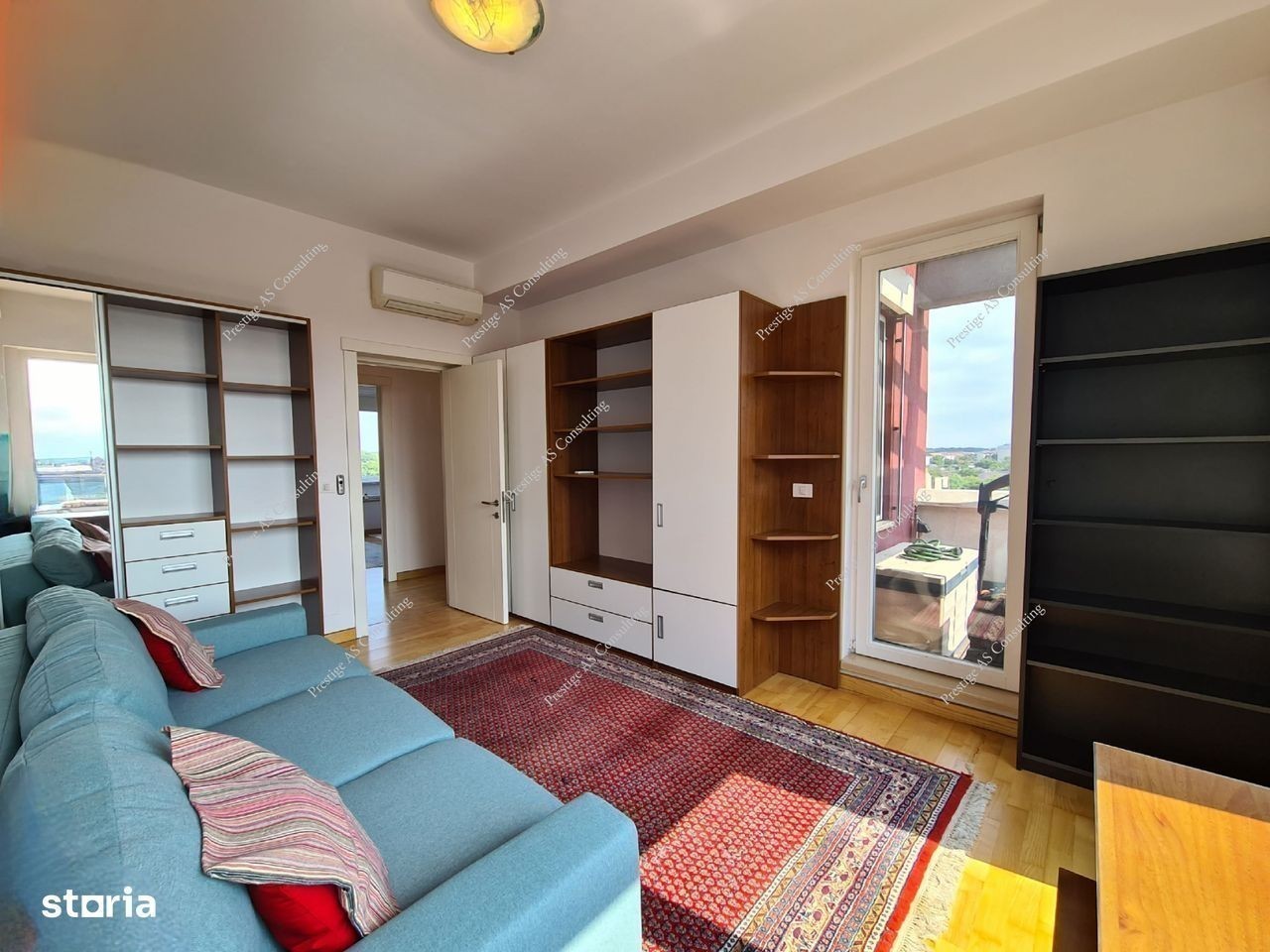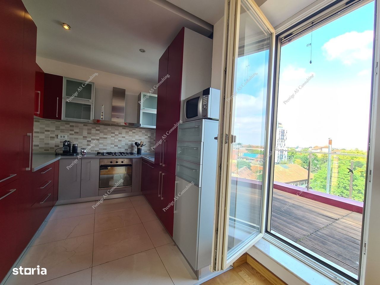 Penthouse cu vedere panoramica, situat la ultimul etaj in ansamblul de blocuri Tender. Suprafata utila: 120 mp + 2 terase (56 mp). Compartimentare: living open space de 56 mp cu spatiu de luat masa (masa din lemn de cires de epoca de 10 persoane), bucatarie complet mobilata si utilata, 2 dormitoare, 2 bai. Fiecare camera are iesire la terasa. Include garaj subteran privat de 35 mp pentru 2 masini cu poarta electrica. Dotari: centrala proprie cu incalzire in pardoseala, ventiloconvectoare de tavan pentru racire, sistem audio Harman Kardon in toate incaperile, jaluzele electrice, sistem de alarma, spatii de depozitare generoase. Disponibil imediat. Se percepe o garantie de 2 luni + comisionul agentiei. Se accepta animalele de companie. Mai multe detalii la telefon