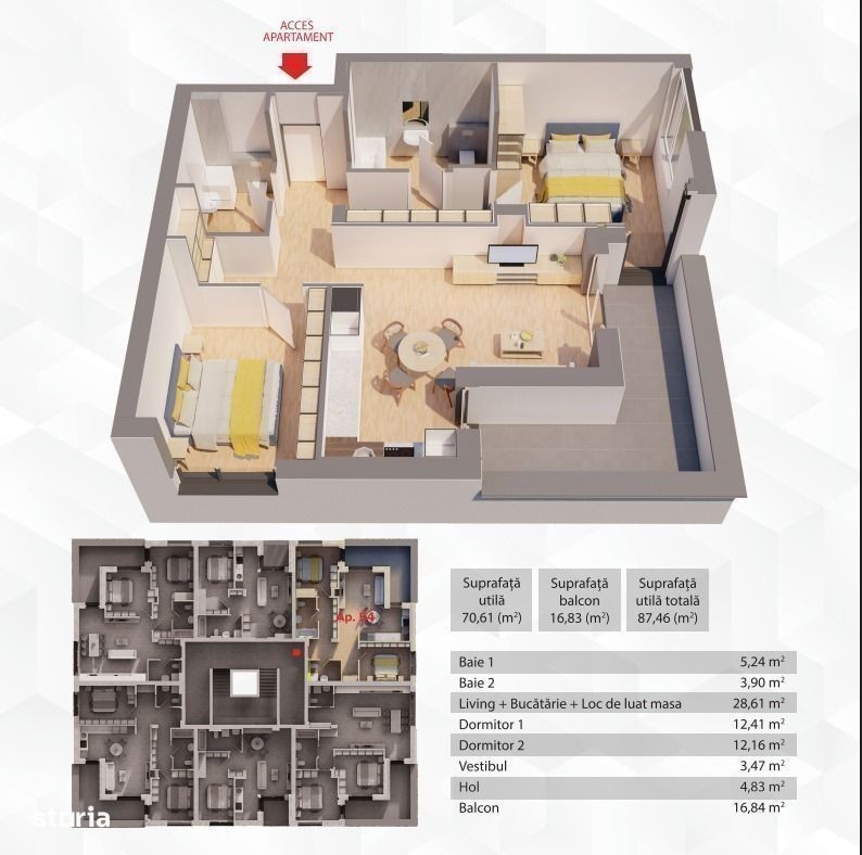 Apartamentul 54 din complexul R39 - cel mai nou proiect ARED, cu finalizare la 01.11.2026, te așteaptă să-l descoperi! Cu o suprafață construită de 104 mp, această locuință modernă este alegerea ideală pentru un cuplu tânăr care își dorește un cămin spațios, luminos și confortabil. Compartimentare inteligentă: bucătărie practică, living generos și luminos, două dormitoare, o baie, balcon deschis pentru momente de relaxare. Confortul termic este asigurat de centrala pe gaz și încălzirea în pardoseală, iar opțiunea de smart home îți permite să controlezi de la distanță funcțiile casei tale - simplu, eficient și modern. Preț valabil până la 30.11.2025! Nu rata șansa de a te muta într-un apartament nou, elegant și adaptat perfect stilului tău de viață! Pentru detalii și vizionări: Andreea Szuchanszki - Consultant ARED Telefon: