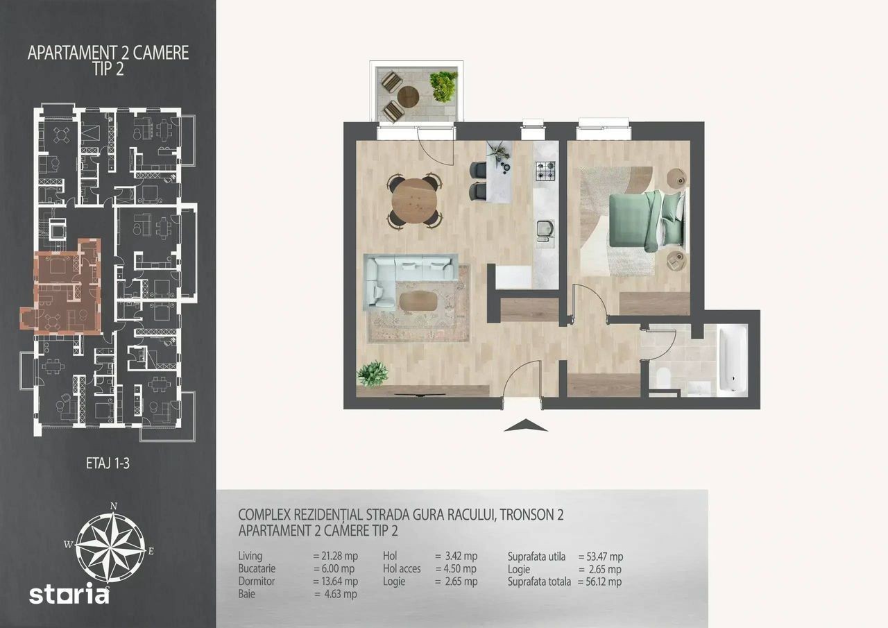 Apartament 2 camere - Nicolae Teclu, Pallady | 0% comision Apartament modern de 2 camere, 53,47 mp utili + balcon 2,6 mp, situat la doar 7-8 minute de mers pe jos de metrou Nicolae Teclu. Dotări: centrală termică în condensare, încălzire prin pardoseală, finisaje incluse la alegere, lift modern, parcări disponibile teran si subteran. Construcție solidă: radier general, cadre și stâlpi din beton armat. Prețuri: 95.404 € + TVA (avans 30%) 89.792 € + TVA (avans 50%) 84.180 € + TVA (avans 90%) *imobil in constructie Detalii și vizionări: