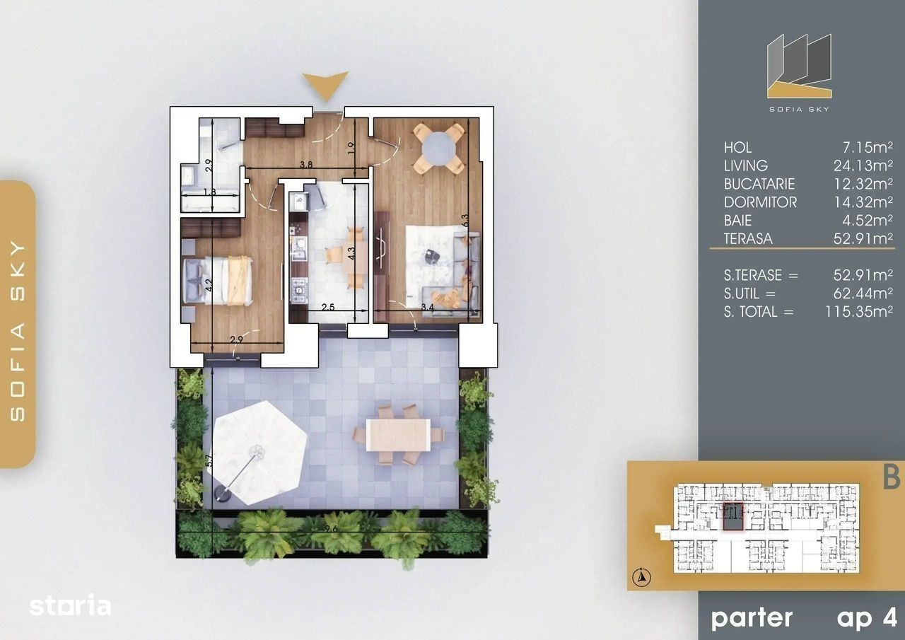2 camere | 62,4 mp utili + terasă 52,9 mp | Predare noiembrie 2025