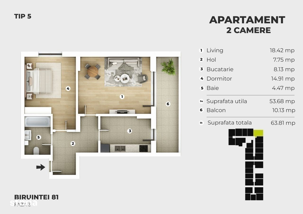 Vânzare apartament 2 camere Decomandat - 63,81 mp, etaj 7/7, 5 minute de Metrou Berceni Se oferă spre vânzare un apartament decomandat, cu o suprafață utilă de 63,81 mp, situat la etajul 7 din 7, într-un ansamblu rezidențial premium.