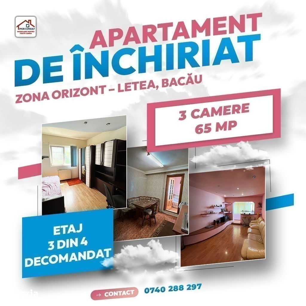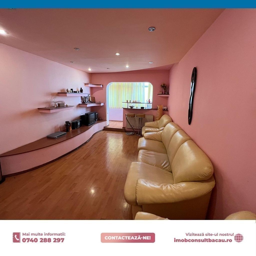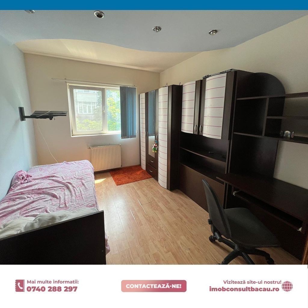 Echipa Imob Consult Bacau, va prezinta spre inchiriere un apartament cu trei camere, situat la etajul 3 al unui imobil cu 4 etaje. Avantaje: 3 camere