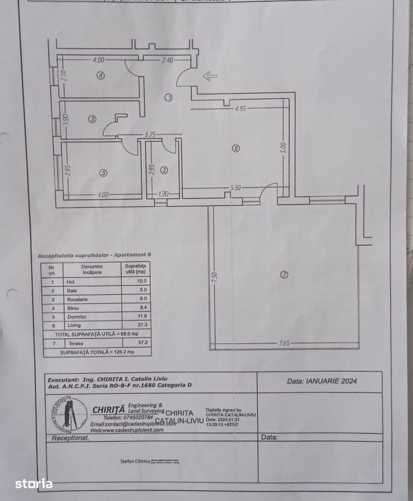 Apartament 3 camere Zona: PAULESTI/ GĂGENI. Etajul 1 suprafața utilă totală 69 mp + TERASA de 57 mp. Dotări: încălzire pardoseală, centrală proprie, tâmplărie Salamander cu geamuri Tripan, uși interior lemn masiv, plai ceramica Marazzi, Italia,obiecte sanitare Ideal Standard,video-interfon, balustrade sticlă fumurie.