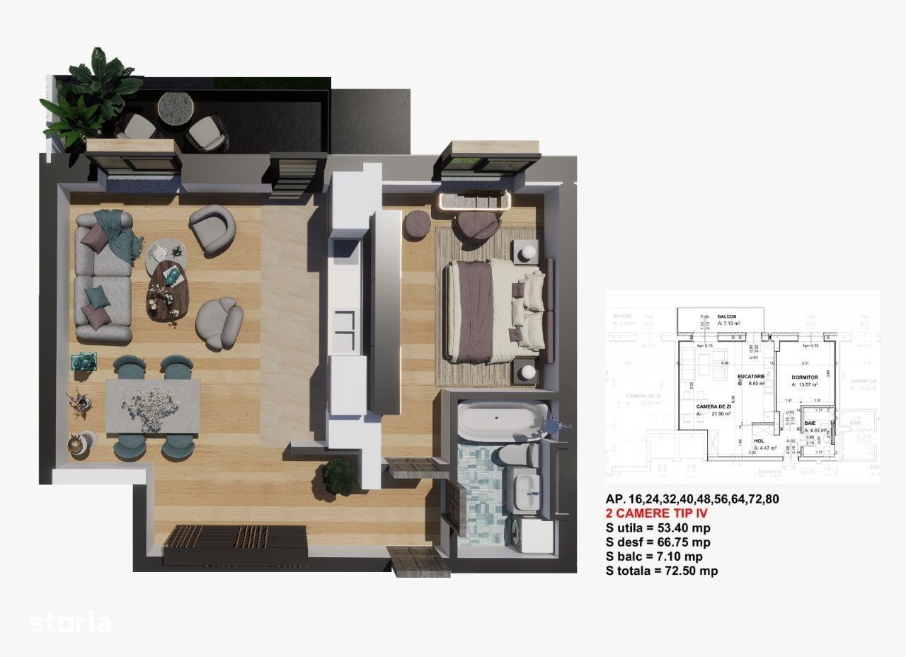 Apartament cu 2 camere, situat in complexul rezidential Satina Park, in imediata apropiere a Parcului Nicolae Romanescu (aproximativ 150-200m). Imobilul are o suprafata utila de 55.8mp si un balcon foarte generos cu suprafata de 7.1mp. Complexul este dotat si cu parcari, cele supraterane avand un pret de vanzare de 7500+tva, iar cele subterane de 12.000 euro +tva.