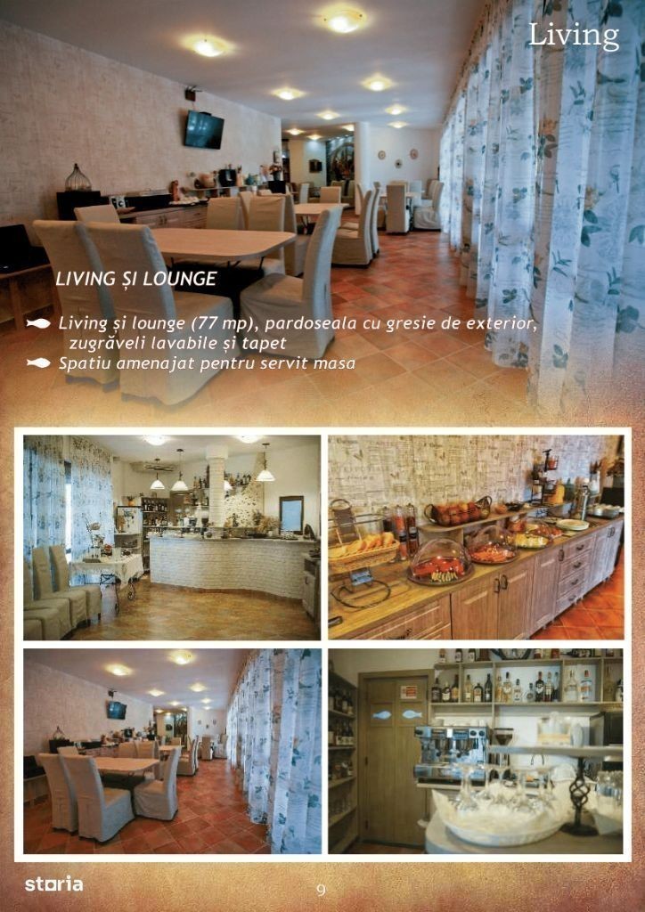 De vanzare Pensiune sau Casa de vacanta situata la 2 km de plaja din Sulina. Cladirea a fost construita in anul 2009 si renovata complet in 2016,fiind compartimentata astfel : 17 camere cu bai,patru terase si alte spatii comune siuate pe cele trei nivele : parter, etaj si mansarda. Terenul pe care este amplasata pensiunea are 1000 mp,iar amprenta constructiei la sol este de 435 mp. Suprafata utila totala a cladirii este de 906 mp.