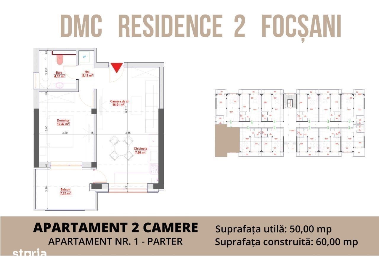 DMC Residence 2 Focșani,va propune spre vânzare un apartament de 2 camere în suprafață de 50 mp,situat în Focșani,str Cincinat Pavelescu în imediata apropriere de Restaurant Laguna,Hotel Solar,Lidl. Am optat pentru o structură de rezistență din fier beton,pereți de cărămidă,izolație de 10 cm,geam tripan,frontoane la balcoane din sticlă securizată, încălzire în pardoseală,centrală termică proprie,uși din lemn masiv,gresie și faianță Italia.