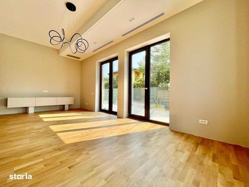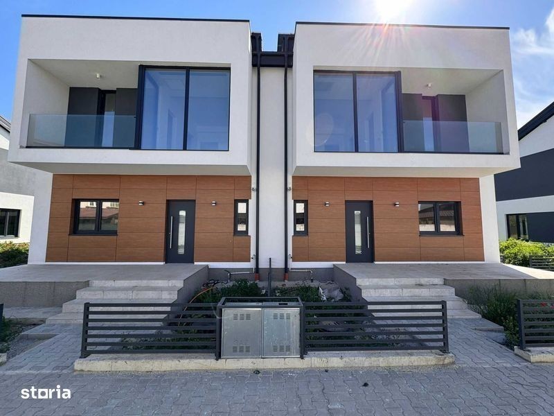 DIRECT PROPRIETAR - Ofer spre vanzare un ansamblu de vile tip duplex format din 6 unitati cu paza si acces privat, conectate la toate utilitatile. Vilele sunt structurate P+1+M cu o suprafata utila de 175 mp utili la care se adauga 30 de mp de terase. Casa este impartita dupa cum urmeza: - Parter: living generos cu zona de dining de 36 mp din care se face accesul catre terasa de 19 mp, bucatarie 11mp, baie, si o camera tehnica si spatii de depozitare. - Etaj: dormitor matrimonial cu dressing si baie proprie cu o suprafata totala de 24 mp, doua dormitoare cu suprafete generoase deservite de o baie, si 2 balcoane. - Mansarda: open space de 43 mp ce se poate amenaja dupa necesitati si o baie. Ficare vila dispune de 2 locuri de pacare in fata casei si de o curte proprie de peste 150 mp. Vila este dotata cu panouri fotovoltaice, incalzire in pardoseala, termostat in fiecare camera pentru reglare temperaturii si sistem de ventilatie HVAC. Casa se preda la alb fara finisaje, la pretul de 250.000 + TVA sau la cheie la pretul de 270.000 + TVA Complexul este securizat si accesul se face controlat de o bariera. La intrarea in complex regasim 10 locuri de parcare pentru vizitatori si oaspeti. In imediata apropiere avem scoli, gradinite, parcuri, magazine si acces facil la mijloacele de transport in comun. Pentru alte detalii sau pentru a programa o vizionare va rog sa ma contactati.
