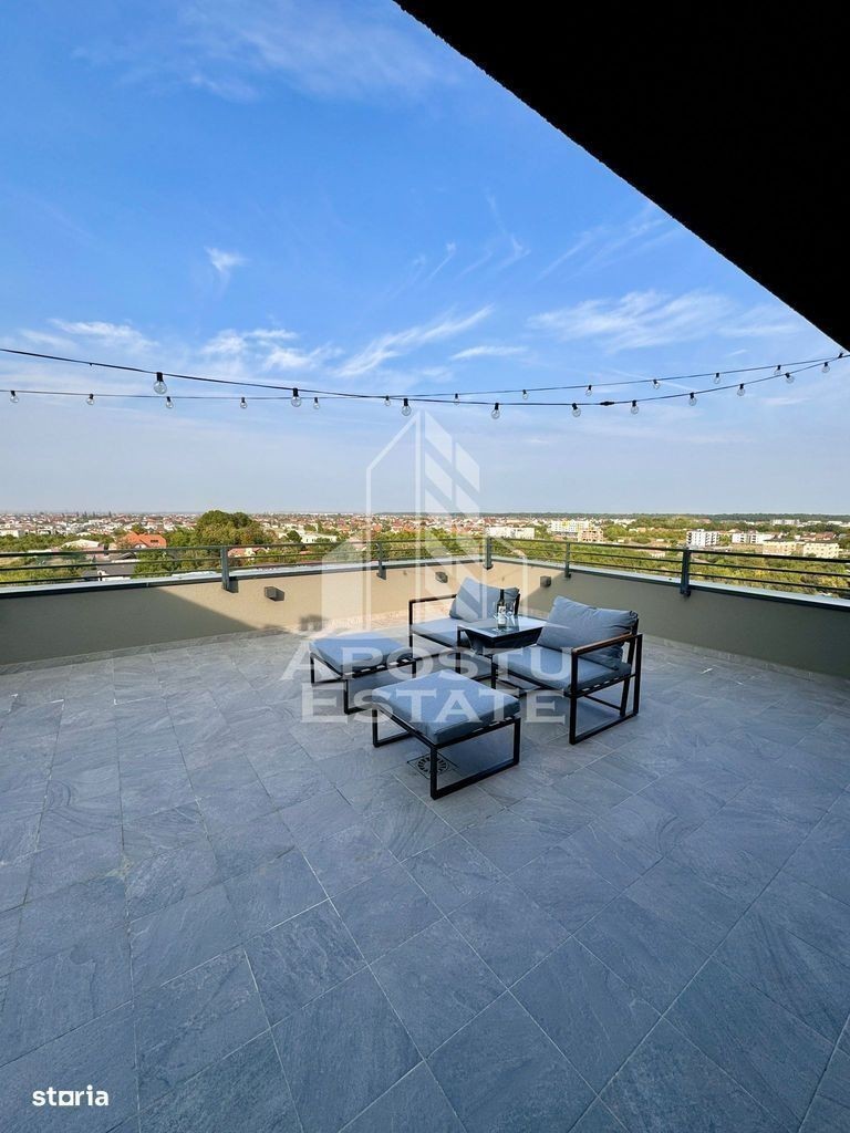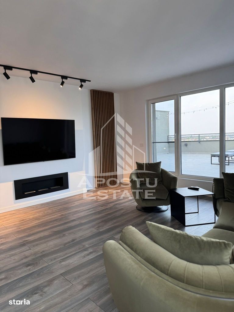 APOSTU ESTATE vă propune spre închiriere un Penthouse spațios și elegant, cu 2 camere, situat într-o zonă liniștită și bine conectată din Timisoara, ideal persoane care doresc un spațiu generos și confortabil. Suprafață utilă: 70 mp Suprafata terasa 45 mp Compartimentare eficientă: Hol de acces generos Bucătărie complet mobilată și utilată, cu loc de luat masa Living luminos și spațios Dormitor matrimonial mobilat Baie principală cu cabina de dus și geam pentru ventilație naturală Confort și facilități: Centrală termică proprie pe gaz Aer condiționat Loc de parcare inclus în preț subteran Apartamentul este complet mobilat și utilat Localizare: Zona Aradului - liniște, acces facil spre oraș, în apropiere de magazine, școli și mijloace de transport în comun. Ideal pentru: Familii Cupluri Profesioniști care lucrează remote sau au nevoie de birou acasă Preț chirie: [787 euro] Grarantia este 800 de euro Programează o vizionare! ID intern: CP2726597