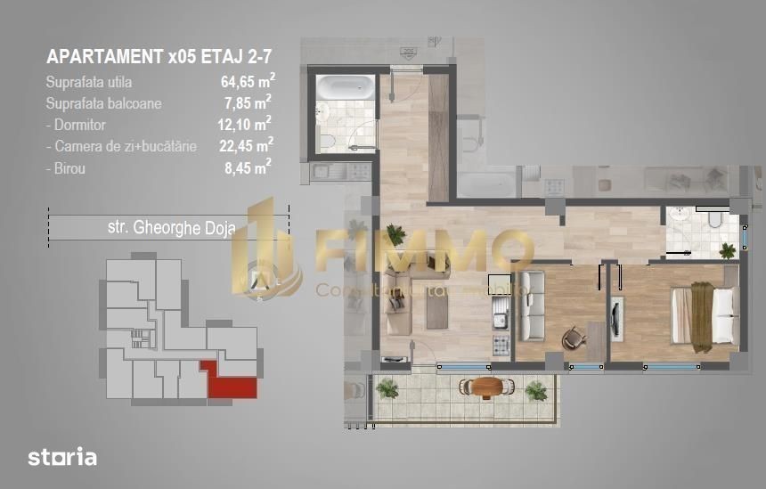 APARTAMENTE DE VANZARE INTR-UN NOU PROIECT REZIDENTIAL DIN SUCEAVA - BURDUJENI - GHEORGHE DOJA - DEZVOLTATOR CU EXPERIENTA! POSIBILITATE RATE PE 4.5 ANI! Apartamente in suprafata de 64.65 mp utili + 7.85 mp balcon! Pretul va fi calculat pe mp util + 2 mp balcon La pretul afisat se adauga TVA! Imobilul se va preda la semifinisat avand incluse in pret urmatoarele: - peretii gletuiti și varuiti; - instalatiile electrice, termice si sanitare; - usa intrare; - sapele turnate; - interfon; - tamplaria pvc. - centrala termica; - incalzire prin pardoseala. Modalitati de plata: - Avans 80% si diferenta la predare - pret 1250 euro mp + TVA - semifinisat - Avans 40% si diferenta la predare - pret 1300 euro mp + TVA - semifinisat - Avans 40% si RATE pe 4.5 ani - pret 1400 euro mp + TVA - semifinisat. Posibilitate de a se opta pentru stadiul "la cheie", adaugandu-se astfel: - gresie: - faianta: - parchet; - usi interior: - aparataje electrice: - corpuri baie: Pentru stadiul cheie se adauga 100 euro in plus mp conform cu varianta de plata aleasa. Proiectul va avea Parter + 7 etaje (P+E). Blocul dispune de lift. Parcari la suprateran contra-cost. Blocul va fi finalizat in vara anului 2027! În cadrul proiectului regăsim apartamente cuprinse intre suprafetele de 36.15 mp + balcon pana la 69.5 mp + balcon. Pentru detalii suplimentare, sau stabilire vizionări, apelați la numărul de telefon