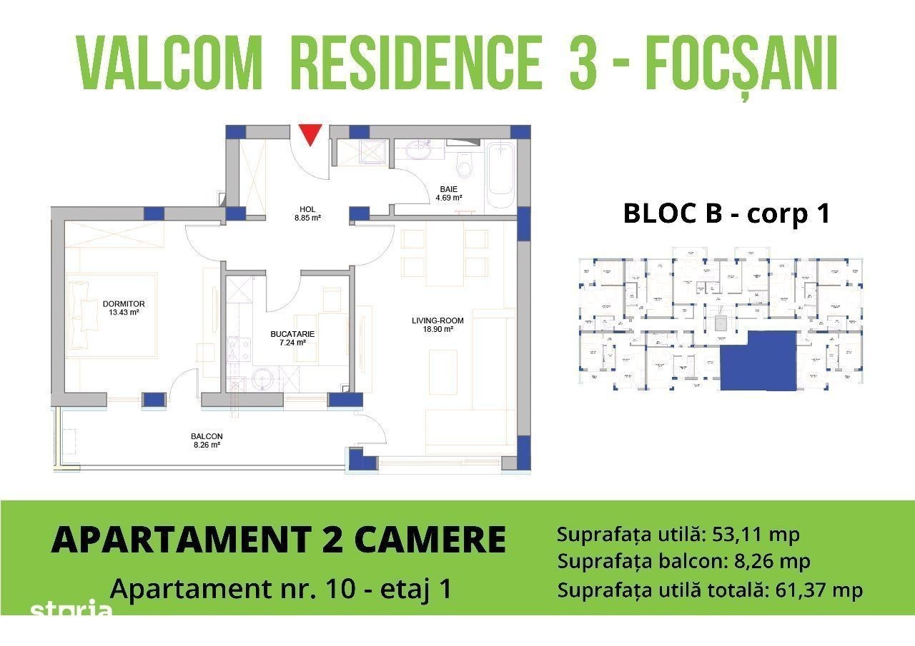DEZVOLTATORUL IMOBILIAR-SC VALCOM CONSTRUCT SRL-Va supune atentiei un apartament 2 camere,situat in Focsani,str Cuza Voda,in imediata apropiere de Socar,Dedeman,decomandata,la etajul 1,S=63 mp mp utili,pret=80.209 euro+TVA.