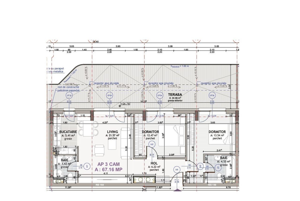 Comision 0%, Apartament 3 cam, 74.84 mp + terasa 50.05 mp, Floresti