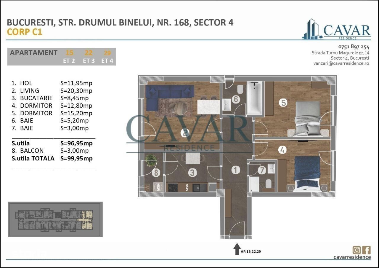 Apartamente Disponibile Direct Cavar Residence - Fără Intermediari și Fără Comision! Biroul nostru de vânzări este situat pe Str. Turnu Măgurele nr. 14, Sector 4, București. Profită acum de prețurile promoționale oferite cu ocazia deschiderii noului nostru proiect rezidențial din apropierea Bulevardului Metalurgiei. Acesta cuprinde garsoniere spațioase și apartamente moderne cu două și trei camere, perfect adaptate nevoilor tale. Noua noastră dezvoltare rezidențială se află pe Strada Drumul Binelui, la nr. 168, Sector 4 București. in apropierea Bulevardului Metalurgiei si a galeriilor comerciale care alcatuiesc Grand Arena Mall. Puteti accesa statia de metrou Aparatorii Patriei (linia M2 Pipera-Berceni), ceea ce va permite sa ajungeti rapid in centrul orasului, utilizand statia de autobuz aflata in proximitatea Complexului. Fiecare unitate locativă este livrată complet branșată la toate utilitățile orașului și beneficiază de contracte individuale cu furnizorii de apă, electricitate și gaze naturale, oferind astfel o gestionare optimă și eficientă a consumurilor. Apartamentele sunt predate catre cumparatori, complet finisate, utilizând materiale de cea mai înaltă calitate, incluzând gresie, faianță, parchet, obiecte sanitare premium în băi, uși interioare, incalzire prin pardoseala, centrală termică proprie, tamplarie pvc cu geam tripan, interfon și ușă de intrare antiefracție, asigurând confortul și securitatea locuinței tale. Aceste locuințe pot fi achiziționate prin orice tip de credit, iar echipa noastră îți oferă asistență gratuită pentru întocmirea dosarului bancar, facilitând procesul de cumpărare. Achiziția se efectuează direct de la dezvoltator, fără intermediari, ceea ce înseamnă o comunicare constantă și eficientă pe tot parcursul procesului de cumpărare, asigurându-te că vei beneficia de suport la fiecare pas până la finalizarea tranzacției. Acceptăm credit și îți oferim asistență gratuită pentru întocmirea dosarului bancar. Prețul afișat nu include TVA! Cu o experiență de 30 de ani în domeniul construcțiilor, Cavar Residence reprezintă o garanție a calității, iar fiecare proiect pe care îl realizăm reflectă standardele înalte pe care ni le asumăm. Imaginile din această ofertă sunt din proiectele noastre anterioare. Imobil aflat in curs de edificare. Programează o întâlnire chiar astăzi cu unul dintre consultantii noștri, pentru a viziona apartamentele din noul nostru proiect si de a discuta detaliile ofertei! În scopul de a garanta că veți primi informațiile corecte și complete referitoare la proiectele noastre, vă rugăm să verificați că persoana care vă va însoți in cadrul vizionării poartă un ecuson cu însemnele distinctive ale brandului Cavar Residence! Detalii bai: bai cu cada si dus Detalii apartamente/etaj: lift Detalii zona: Mall Grand Arena Detalii compartimentare spatiu: Hol 11.95 mp Living 20.30 mp Bucatarie inchisa 8.45 mp Dormitor 12.80 mp Dormitor 15.20 mp Baie 5.20 mp Baie 3.00 mp Balcon 3.00 mp