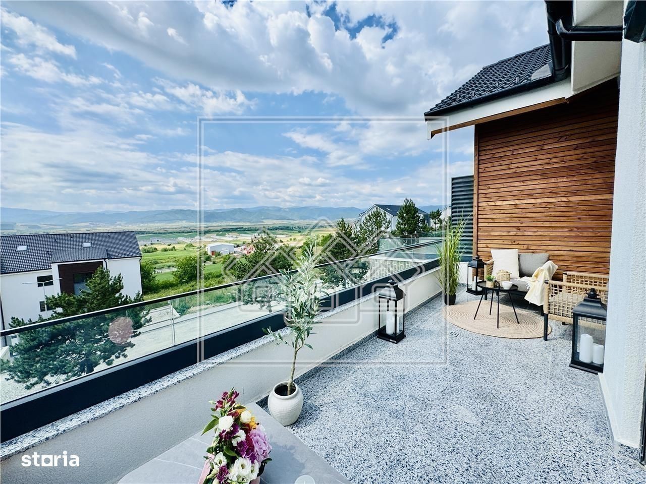 Penthouse de vanzare in Sibiu cu 5 camere, 3 bai si aer conditionat inclus, montat de dezvoltator Imobilul este intabulat si disponibil imediat. Acesta poate fi achizitionat si cu ajutorul unui credit bancar. Contoarele de gaz si curent sunt montate, astfel te poti muta imediat. Acesta are o suprafata utila de 128.54 mp si beneficiaza de o logie cu suprafata de 15.44 mp. Dotari penthouse: masina de spalat rufe, masina de spalat vase, televizoare, frigider, plita si cuptor incorporate, hota, mobila de bucatarie realizata pe comanda si multiple spatii de depozitare. Locuinta a fost amenajata de un designer de interior, cu atentie la detalii, pentru a oferi un spatiu modern, confortabil si perfect functional. Caracteristici tehnice de constructie: - Eficienta energetica prin: izolatie cu vata bazaltica, incalzire in pardoseala, centrala termica in condensatie, tamplarie PVC cu 5 camere si 3 foi de sticla, jaluzele electrice pe partea sudica, aparat de aer conditionat inclus in standard pentru fiecare apartament - Balcon finisat cu granit si balustrada din sticla securizata - Casa scarii placata cu granit - Fatada decorata cu larice siberian si piatra naturala. Caracteristici ansamblu rezidential DaVinci Homes: - 45% din suprafata destinata spatiilor verzi - Sistem automatizat de irigatie pentru spatiile verzi - Arbori ornamentali maturi inca din prima zi - Priveliste panoramica spre munti - Orientare sudica pentru toate balcoanele - Locuire in vile cu 6, 9 sau 12 apartamente - 4 intrari si iesiri in cadrul ansamblului - Locuri de joaca amenajate in cartier - Locuri de parcare incluse - Drumuri complet pavate - Vile construite in trepte de nivel. (apartamentul nr. 9 vila 39E) Vino in ansamblul nostru, programeaza acum o vizionare si vezi cele mai noi apartamente de pe piata imobiliara Sibiu. Locatie: Zona de Vest a orasului Sibiu, in cartierul rezidential DaVinci Homes. Acesta este situat la o distanta de 4 minute pana la Metro si 15 minute pana in centrul istoric al Sibiului. Comision 0 la achizitionare.