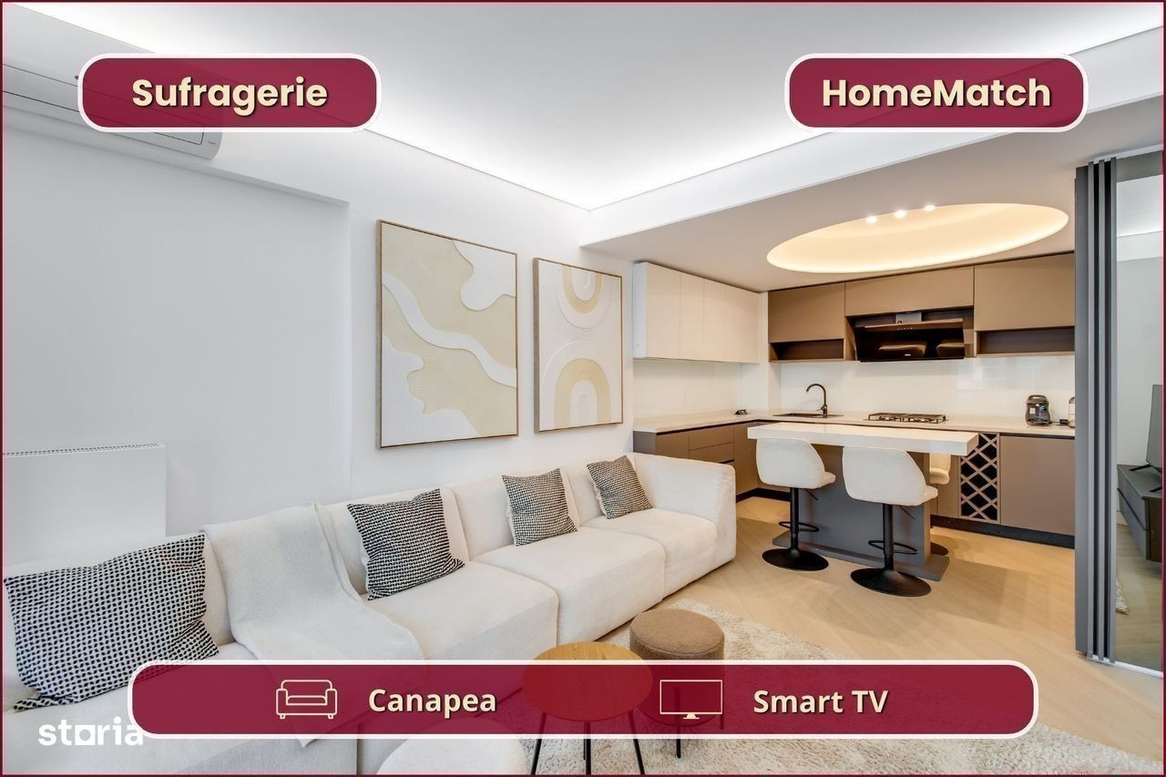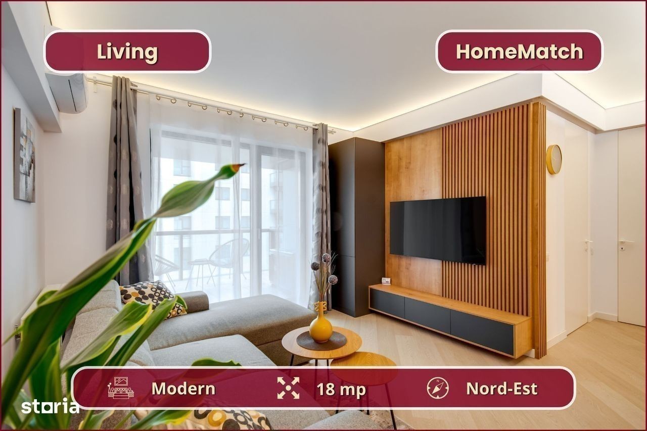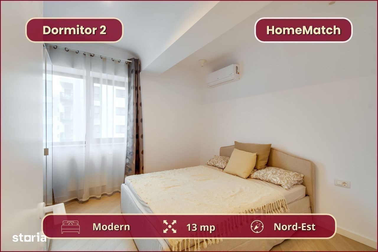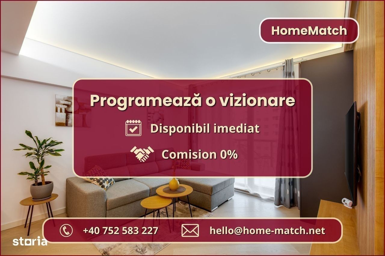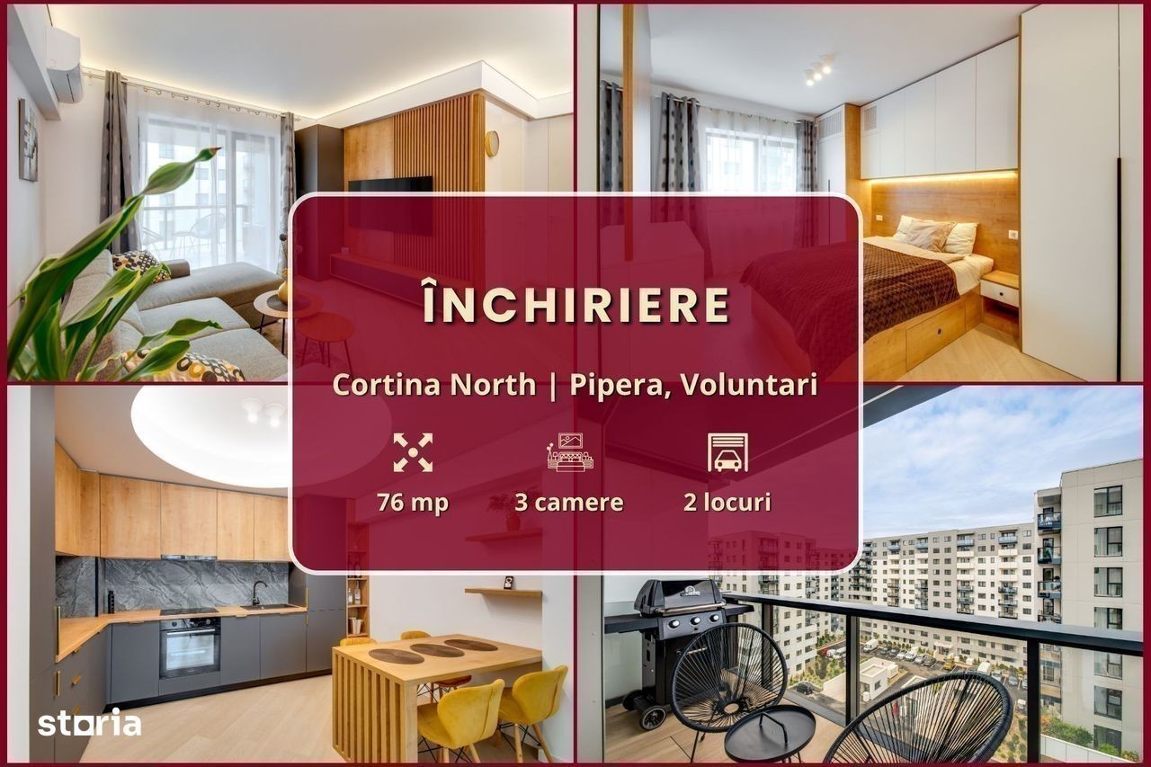 Vrei să locuiești într-un cartier exclusivist din Nordul Bucureștiului? Vrei să ajungi mai repede la biroul din Pipera, la școlile internaționale de prestigiu și la restaurantele selecte de pe Șoseaua Nordului? Închiriază unul dintre superbele apartamente din ansamblul rezidențial Cortina North! Ansamblul Cortina North se află în zona Pipera (Voluntari, Ilfov), la doar 3 minute de centrul comercial Pipera Plaza. Apartamentul are o suprafață totală de 76 mp și este compus din: - living (18 mp): amenajat cu canapea și smart TV; - bucătărie (6 mp): deschisă, mobilată și utilată complet; - balcon (10 mp): nemobilat; - dormitor matrimonial (15 mp): dotat cu pat dublu și dressing; - baie matrimonială (5 mp): dotată cu cadă; - dormitor secundar (12 mp): se mobilează la cerere; - baie secundară (3 mp): dotată cu duș - hol de acces (8 mp): amenajat cu dressing. Finisajele, mobilierul și electrocasnicele sunt produse noi, de cea mai bună calitate: - fațadă ventilată, obiecte sanitare și tâmplărie aluminiu de înaltă calitate; - mobilier nou, de cea mai bună calitate; - mașină de spălat rufe, mașină de spălat vase, frigider, cuptor, aragaz, hotă. Ansamblul rezidențial dispune de următoarele facilități: - parcare subterană pe 2 niveluri (1 loc inclus): mașinile sunt ferite de praf, soare și precipitații; - centru wellness, bazin semiolimpic și pistă de alergare: stil de viață activ și sănătos. Împrejurimile oferă acces facil la toate obiectivele (cu mașina): - centre de business: Swan Office Park (3 min); - centre comerciale: Pipera Plaza (3 min); - restaurante: Nor Sky Casual (6 min); - săli de sport: 18Gym Pipera (2 min); - grădinițe și școli: Olga Gudynn Pipera (8 min); - parcuri și atracții turistice: Parcul Herăstrău (9 min); - transport: stație STV (1 min), metrou Aurel Vlaicu (6 min). Condiții de închiriere: - disponibilitate: imediat; - perioadă minimă: 1 an; - animale de companie: nu sunt permise; - fumat: permis doar pe balcon; - chirie: 1.050 euro + TVA / lună - garanție: echivalentul unei luni de chirie. Și pentru ca semnarea contractului de închiriere să fie cât mai simplă pentru tine, ți-am pregătit o ofertă imbatabilă: 0% comision! Programează o vizionare acum! HomeMatch Alege-ți locuința, nu doar o casă oarecare