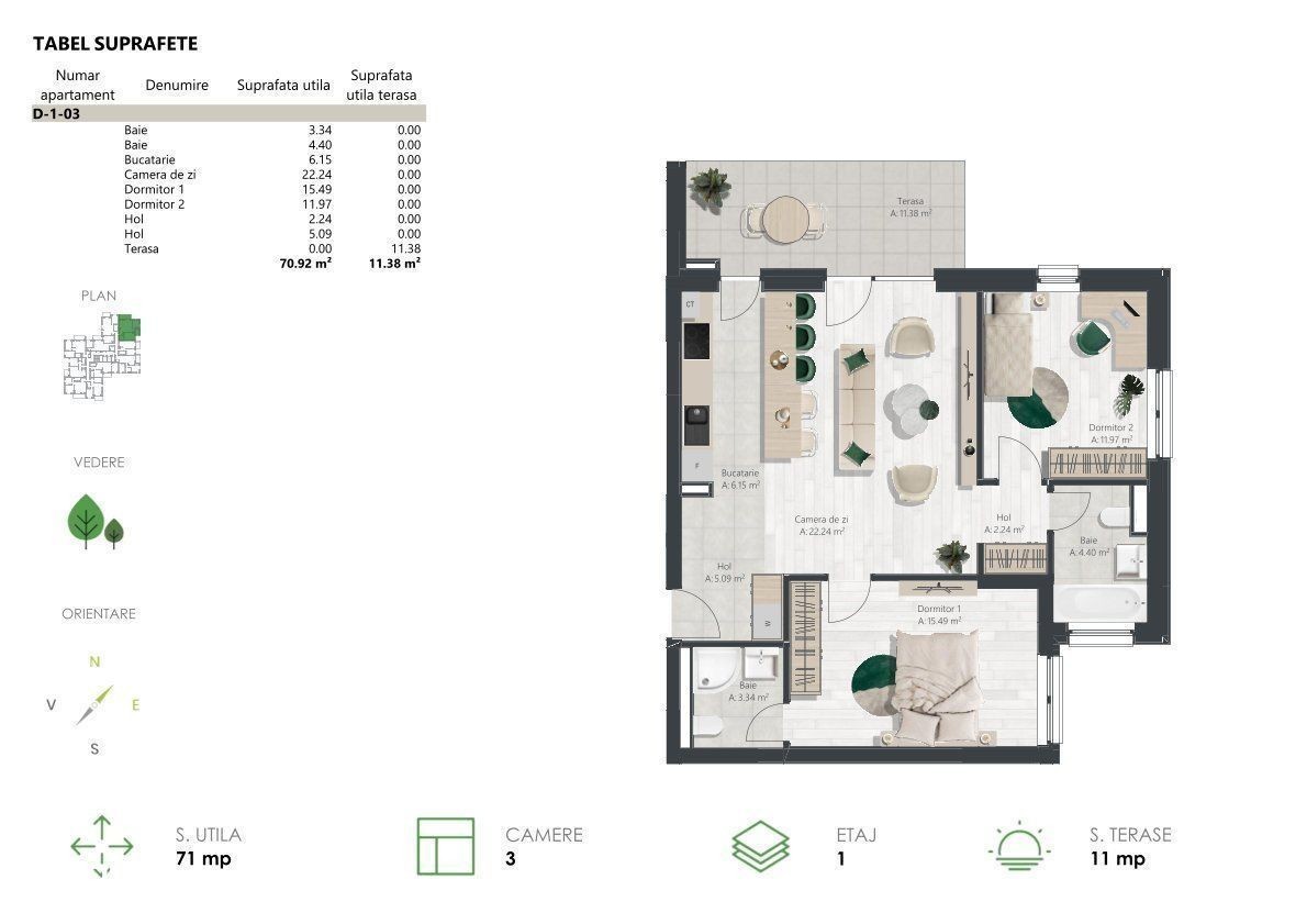 Denya Forest a fost gândit ca un loc de refugiu perfect, într-o locație privilegiată din nordul Timișoarei, la marginea Pădurii Verzi, în mijlocul unei comunități ce împărtășește aceleași valori ca și tine. Cu un total de 117 apartamente construite la standarde occidentale, blocul 6 oferă finisaje de calitate superioară și sisteme moderne de încălzire în pardoseală. Gama variată de locuințe include apartamente cu 1.5, 2, 2.5 și 3 camere, precum și penthouse-uri, cu multiple opțiuni de compartimentare, astfel încât să răspundă nevoilor și dorințelor tale. Designul inteligent al spațiilor interioare asigură un confort maxim, iar ferestrele mari și terasele spațioase creează o legătură naturală între căldura locuinței și prospețimea pădurii din apropiere. Atmosfera unică te face să te simți acasă, într-un echilibru perfect între natură și modernitate. Blocul 6 aduce un plus comunității Denya Forest prin adoptarea conceptului inovator nZEB (Nearly Zero Energy Building), care reduce semnificativ consumul energetic și implicit costurile de întreținere, protejând în același timp mediul înconjurător. Detalii tehnice de ultimă generație: • Sistem de încălzire și apă caldă prin pompe de căldură hibrid, Daikin sau similar. • Sisteme de climatizare moderne cu ventiloconvector CLINT sau similar. • Izolație termică exterioară cu polistiren expandat de 12 cm, pentru eficiență energetică ridicată. • Pereți interiori din gips-carton de 12.5 cm, cu izolație fono și termo, pentru un confort sporit. • Ferestre din profile PVC cu 5 camere - Trocal Kommerling sau similar, și geam tripan cu peliculă LowE pentru performanță energetică optimă. Facilități pentru rezidenți: • Locuri de parcare subterane și supraterane. • Acces la transport public: linia de autobuz 46, cu stație pe strada Constructorilor, chiar în interiorul ansamblului Denya Forest. • Parc amenajat cu spații verzi și locuri de joacă pentru copii. • Apropierea de magazine, centre comerciale, școli, săli de sport. • Locație de vis lângă Pădurea Verde, un parc vast de 10,5 hectare, ideal pentru plimbări și activități recreative, fie pe jos, fie cu bicicleta. Denya Forest este un complex durabil și sigur, construit să reziste în timp, asemenea unei păduri. Te invităm să ne vizitezi și să descoperi viitorul tău apartament, în inima verde a Timișoarei!