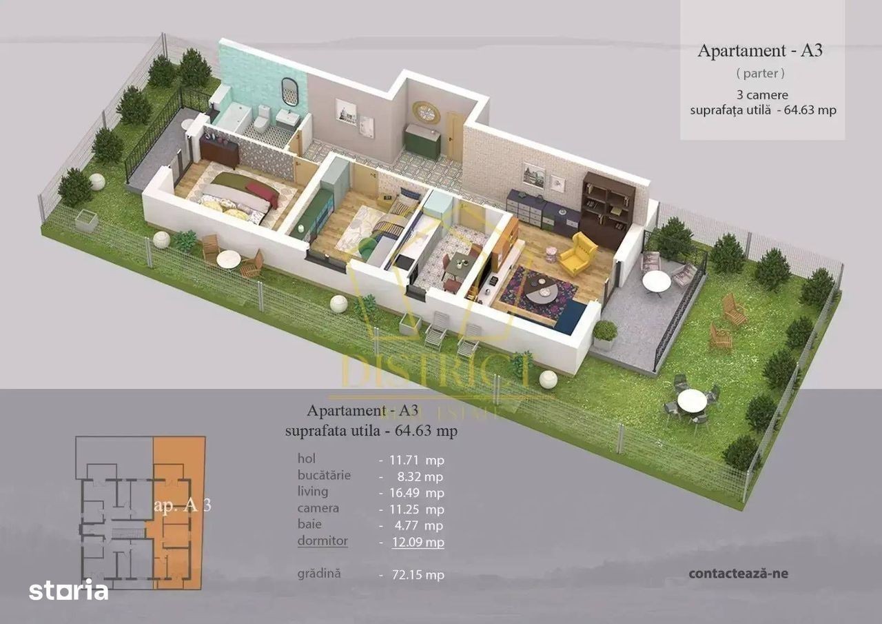 District Real Estate va propune spre vanzare un apartament superb cu 3 camere si gradina de 73mp, finisaje premium situat in Giroc, avand in proximitate statie de transport in comun si numeroase centre comerciale si Primaria Giroc. Apartamentul este pozitionat la parter si va ofera spațiul perfect pentru a va crea un camin confortabil și primitor. Apartamentul are 65 mp utili si prezinta urmatoarea compartimentare - Hol acces - Living cu acces la balcon si gradina - Bucatarie inchisa - Dormitor matrimonial - Dormitor - Baie Confortul termic se realizeaza cu ajutorul centralei proprii, prin pardoseala. Mai multe detalii: - Constructie realizata in anul 2023 din caramida Porotherm - Exterior izolat cu polistiren de 10 cm - Pereti despartitori complet din caramida, tencuiti mecanizat finisati cu glet si vopsea lavabila alba. - Geamuri termopan cu 3 sticle pentru izolare atat fonica cat si termica superioara, foarte mari si luminoase. - Centrala proprie, sistem eficient de incalzire in pardoseala. - Usa acces securizata Apartamentul se vinde nemobilat cu 1 loc de parcare inscrise in CF, la pretul de 139.900 euro. Oferim consultanta si solutii financiare in vederea obtinerii unui credit imobiliar avantajos, cu ajutorul colaboratorilor nostri. Pentru vizionari si alte detalii va stam la dispozitie.