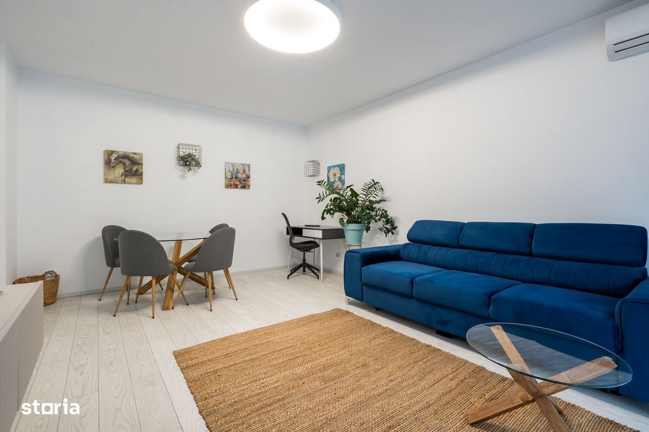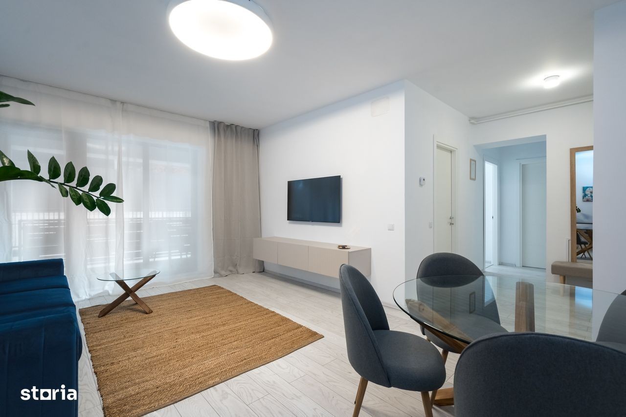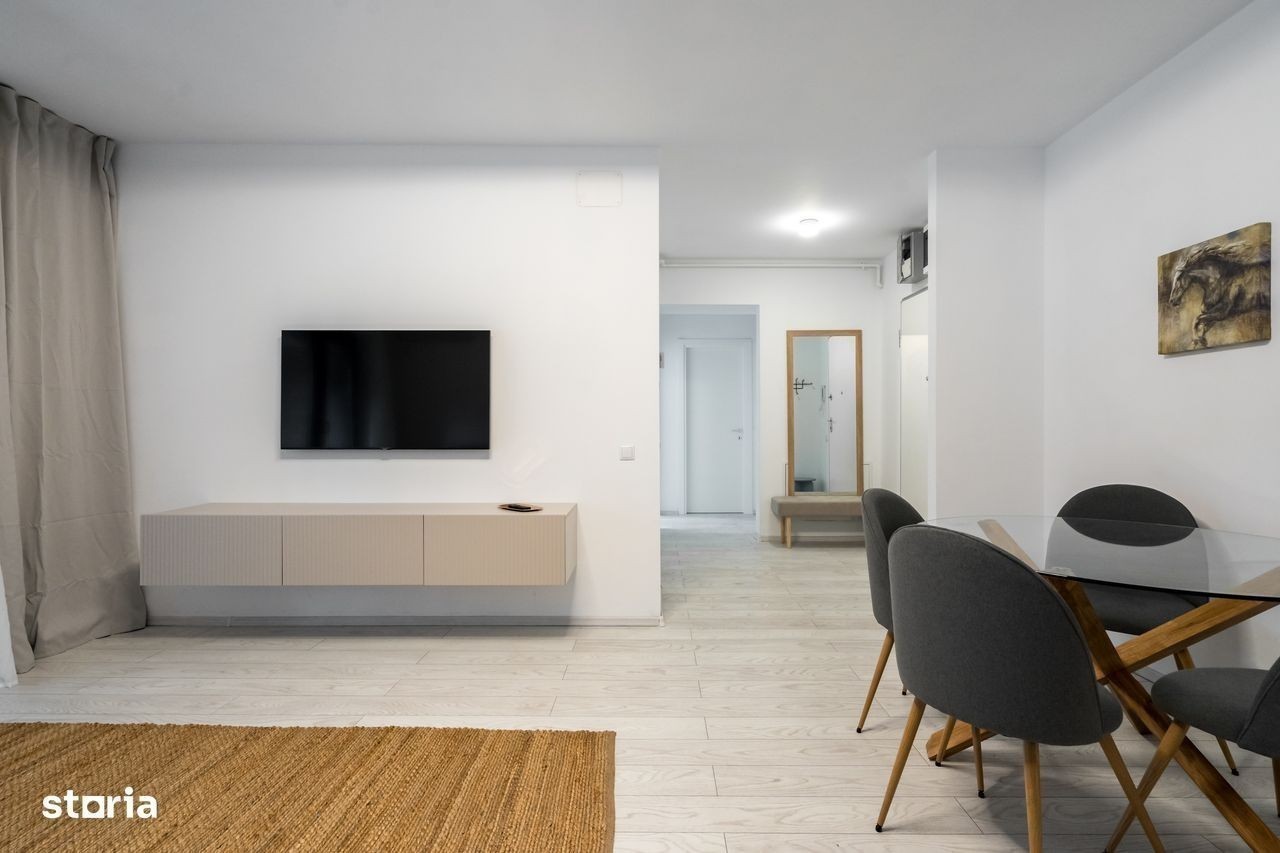 Apartament nou cu 2 camere in complexul The Class Apartments 3, pe Bulevardul Pipera 21bis, la parter, cu loc de parcare inclus in pret. Incalzire in pardoseala, masina de spalat vase, masina de spalat rufe cu functie de uscare, televizoare smart, canapea extensibila, pat boxspring.