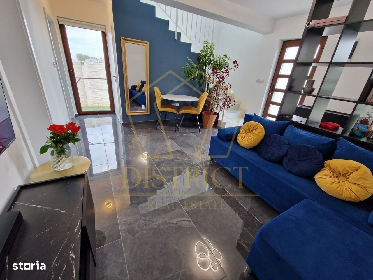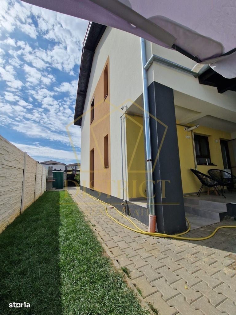 Va propunem spre vanzare un duplex modern, construit in anul 2023, situat in zona Calea Urseni, intr-o zona linistita si usor accesibila, aproape de oras si de centura Timisoara. Proprietatea are o suprafata utila de 76 mp, fiind amplasata pe un teren de 150 mp, si dispune de 3 locuri de parcare in fata casei. Duplexul beneficiaza de o terasa acoperita de 15 mp, dotata cu masa si scaune, ideala pentru relaxare. Constructia este realizata pe regim de inaltime P+1+pod, cu placa de beton peste etaj, asigurand rezistenta si functionalitate. Compartimentare: Parter: living spatios, bucatarie separata, baie si debara Etaj: hol, doua dormitoare (unul cu balcon) si o baie Pod: izolat cu polistiren de 20 cm Dotari si facilitati: -Incalzire in pardoseala (centrala pe gaz, 6 termostate independente) -Aer conditionat -Rulouri exterioare -Sistem de supraveghere video -Curte amenajata, cu gratar -Terasa acoperita cu mobilier complet Duplexul se vinde complet mobilat si utilat, exact ca in fotografii. In living se gasesc o canapea extensibila, balansoare, masa cu scaune, biblioteca si comoda. Bucataria este mobilata la comanda si complet utilata cu masina de spalat vase, plita pe inductie, cuptor, hota, frigider, masa cu scaune si TV. La parter se afla o baie cu dus si o debara dotata cu masina de spalat rufe. La etaj, dormitorul cu balcon este echipat cu TV, birou si dulap, iar dormitorul matrimonial dispune de pat 180x200, noptiere, dulap si comoda. Baia de la etaj este dotata cu cada. Locuinta este conectata la toate utilitatile: curent electric, gaz, apa de la retea, canalizare si fibra optica pentru TV si internet. Situata intr-o zona in plina dezvoltare, proprietatea se afla aproape de Zone 2, centura Timisoara, supermarketuri (Mega Image, Profi), farmacie si Continental, iar statia de autobuz se afla la doar 400 m distanta. Casa este locuita in prezent, insa se poate elibera imediat. Pret: 170.000 euro Pentru informatii suplimentare si programarea unei vizionari: Ovidiu Hantig -