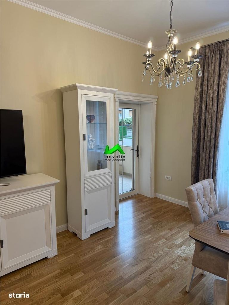 Agentia imobiliara Inovativ va ofera spre inchiriere un apartament de lux, cu o suprafata utila de 120 mp, pozitionat lam parterul unei cladiri amplasate central. Locuinta este la prima inchirere, complet mobilata, utilata si este compusa din hol, living generos, 2 dormitoare spatioase, 2 bai si terasa. Locuinat dispune de supraveghere video si alarma, seif, incalzire in pardoseala, clima, etc. Imobilul este pozitionat intr-o zona bine cotata pe piata imobiliara, centrala, avand in imediata apropiere numeroase puncte de interes public.