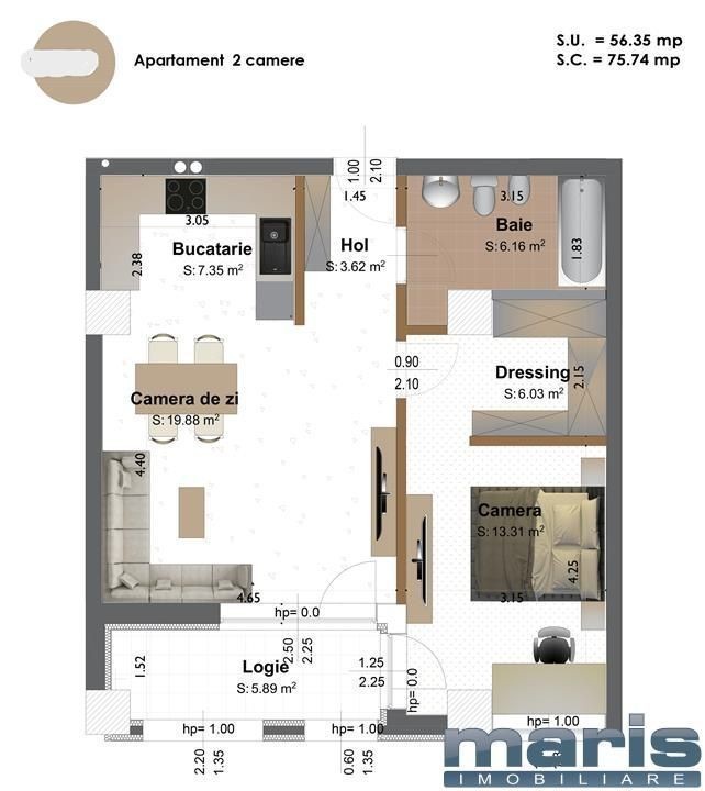 Agentia imobiliara MARIS oferim spre vanzare apartament cu 2 camere cu suprafata utila de 56 mp in complexul rezidential Concept 9 - Shopping City. Apartamentul este semifinisat, inaltime 270 cm, centrala pe gaz pe imobil cu repartitoare separate pentru fiecare apartament, termostat separat pentru fiecare incapere, tamplarie PVC cu geamuri tripan, 2 lifturi. Pardoseală cu șapă de beton, izolată termic și fonic, balcoanele sunt placate cu granito-gresie și balustrăzi metalice si sticlă securizată. Instalații electrice interioare pregatite pentru montarea sistemelor de casă inteligentă. Obiecte sanitare în băi, spălător cu cuvă și picurător bucătărie. Sistem de climatizare cu aer condiționat, video interfon color digital cu control acces și monitorizare la distanță. Parcare proprie langa bloc. Dotari complex Concept 9 Loc de joacă amenajat, spații verzi și parc de 2.000 mp destinat exclusiv locatarilor. Sistem de supraveghere și acces controlat în imobile, parcări și spații comune exterioare. Spațiu dedicat pentru paza complexului rezidențial 24 24. Locuri de parcare dedicate pentru vizitatori, servicii de utilități, taxi, curierat și persoane cu handicap, rastele pentru biciclete. Stații de încărcare pentru mașinile electrice. Serviciu de administrare pentru întregul complex care include paza ansamblului, întreținerea spațiilor verzi, curățenia și deszăpezirea trotuarelor și a drumurilor comune. Program agentie Luni - Vineri 9 -18 informatii suplimentare si vizionari cu programare la telefon