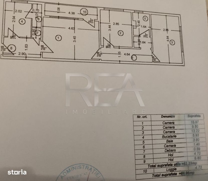 R.E.A Imobiliare vă propune să vizionați un apartament cu 3 camere de vânzare la prețul de 122.000 de euro la 600 de metri de stația de metrou Nicolae Grigorescu sau în maximum 12 minute o să ajungeți la mijlocul de transport. Locuința este situată la etajul 4 din 4 al blocului construit în anul 1967 și se mai învecinează cu:un cabinet de obstretică-ginecologie,o benzinărie,piața Sălăjan,grădinițe,școli,un cluburi sportive,un medic specialist în medicina muncii,parcul Titanii,stațiile autobuzelor 101,102,243 și 311,policlinica Titan,farmacii,restaurante,săli de fitness și magazine alimentare. Bloc construit în 1967 -făra risc seismic Credit ipotecar sau transfer bancar Propietarul vinde apartamentul nemobilat și neutilat,iar variantele de plată acceptate de acesta sunt creditul ipotecar și transferul bancar. Vânzătorul imobilului a cumpărat și montat corpuri de iluminat cu led smart în fiecare cameră cu 16 posibilități de modificare a luminii Imobilul beneficiază de un aer condiționat cu invertor,astfel încât în lunile de iarnă temepatura să depășească 20 de grade,iar vara să răcorească fiecare încăpere pentru confortul dumneavoastră. Propietarul a zugravit și renovat total apartamentul anul acesta. Apartamentul are o suprafață totală de 66,96 mp și se împart în felul următor: -sufrageria se ]ntinde pe 15,97 mp; -primul dormitor măsoară 9,80 mp; -al doilea dormitor,cel matrimonial ocupă 13,22 mp; -bucătăria de 5,93 mp; -baia cu 3,80 mp'; -o camer[ de 1,40 mp; -o debara cu 0,59 mp; -un hol de 4,72 mp; -alt hol de 6,80 mp. Pentru programarea vizionării sunați la unul din numerele de telefon afișate pe site-ul reaimobiliare.Agentul imobiliar o să vă apeleze în cel mai scurt timp posibil. P8681