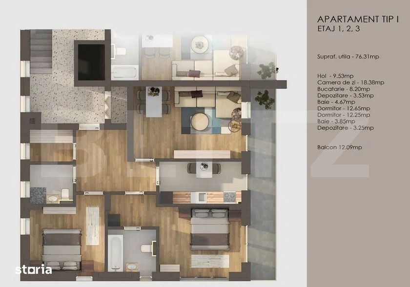 BLITZ propune spre vânzare un apartament spațios cu 3 camere, situat la etaj intermediar (1-3), într-un bloc nou și modern din zona Tractorul - cea mai dezvoltată și dorită zonă rezidențială din Brașov. Cu o suprafață utilă generoasă de 76 mp, completată de un balcon de 12 mp, acest apartament oferă un cadru ideal pentru o familie sau pentru cei care caută confort și calitate într-un spațiu modern. Locuința beneficiază de încălzire în pardoseală, finisaje premium și multă lumină naturală, iar compartimentarea este practică și bine gândită. Detalii cheie: Suprafață utilă: 76 mp Balcon: 12 mp Etaj: 1 / 2 / 3 (în funcție de disponibilitate) Camere: 3 Băi: 2 Încălzire în pardoseală Compartimentare: living cu bucătărie open-space, 2 dormitoare, 2 băi, balcon Posibilitate achiziție loc de parcare: 9.000 EUR Apartamentul este situat într-o zonă excelentă, cu acces rapid la mall, supermarketuri, școli, restaurante, parcuri și mijloace de transport - o investiție ideală atât pentru locuință personală, cât și pentru închiriere. Contactează-ne pentru detalii suplimentare și programarea unei vizionări!