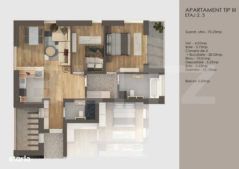 BLITZ propune spre vânzare un apartament modern cu 3 camere, situat la etaj intermediar (2 sau 3) într-un bloc nou din Tractorul - cea mai căutată și dezvoltată zonă a Brașovului. Apartamentul are o suprafață utilă de 70 mp, la care se adaugă un balcon de 5,20 mp, ideal pentru relaxare în aer liber sau pentru momentele de dimineață. Locuința este compartimentată eficient, cu zone de zi și de noapte bine delimitate, și oferă încălzire în pardoseală, finisaje premium și luminozitate naturală generoasă. Detalii cheie: Suprafață utilă: 70 mp Balcon: 5,20 mp Etaj: 2 sau 3 (în funcție de disponibilitate) Camere: 3 Băi: 2 Încălzire în pardoseală Compartimentare: living cu bucătărie open-space, 2 dormitoare, 2 băi, balcon Posibilitate achiziție loc de parcare: 9.000 EUR Situat într-o zonă în plină expansiune, cu acces facil către mall, școli, restaurante, parcuri și mijloace de transport în comun, acest apartament este o alegere excelentă pentru locuință personală sau pentru investiție.