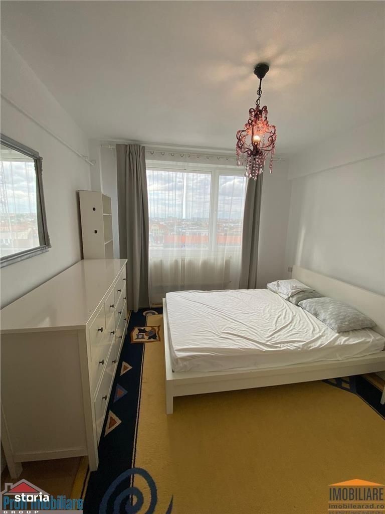 Profi Imobiliare in parteneriat cu Imobile Arad va ofera spre inchiriere un superb apartament cu 3 camere situat ultracentral pe Bulevardul Revolutiei, oferind un view superb asupra intregului oras fiind situat la etajul 10, bloc cu lift, apartamentul este complet mobilat si utilat, foarte curat, renovat, avand un hol spatios la intrare, bucatarie mare mobilata si utilata, living luminos cu canapea extensibila, 2 dormitoare, baie cu dus, spatui pt depozitare, acest apartament ofera un spatiu clad si primitor pentru tine si familia ta. Pret 415 euro luna + garantie contravaloarea unei chirii. Pentru detalii si programarea unei vizionari te astept sa ne contactezi la tel