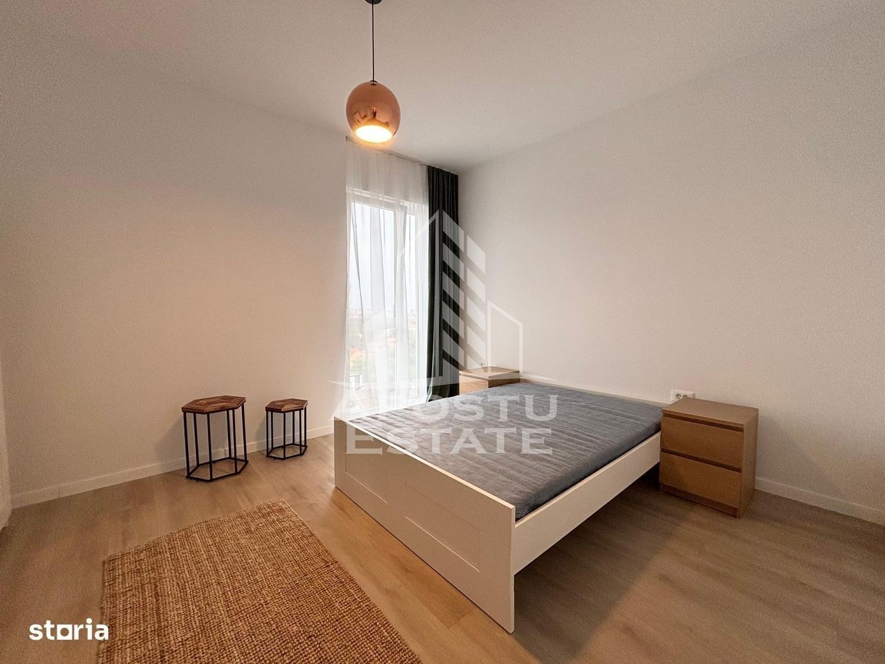APOSTU ESTATE va propune spre inchiriere un apartament modern si complet utilat, cu 2 camere, situat in zona Torontalului, ideal pentru cupluri sau profesionisti care cauta confort si acces rapid catre punctele cheie ale orasului. • Etaj 7/11 • Bloc nou cu lift Suprafata utila: 56 mp Compartimentare semidecomandata: • Hol de acces • Living open space cu bucataria • Dormitor mobilat • Baie cu cada • Terasa de 18 mp Dotari si facilitati: • Centrala proprie cu incalzire prin calorifere • Aer conditionat • Masina de spalat vase • Masina de spalat haine • Apartamentul se inchiriaza complet mobilat si utilat • Loc de parcare inclus Localizare excelenta: Situat in zona Torontalului, apartamentul ofera acces facil la mijloace de transport, centre comerciale si principalele puncte de interes ale orasului. Pret chirie: [500€] Garantie: o luna Programeaza o vizionare! ID intern: CP2754673