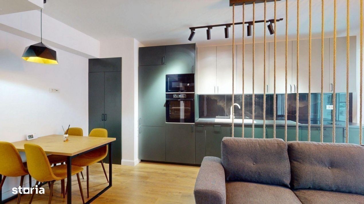 De închiriat! Situat la parterul unui imobil nou din complexul MTM Pipera Residence, acest apartament se remarcă prin designul contemporan, finisajele premium și compartimentarea eficientă, oferind un ambient cald și elegant. Interiorul este complet amenajat, cu atenție la detalii și la optimizarea spațiului - fiecare zonă fiind gândită pentru confort și funcționalitate. Livingul spațios se integrează armonios cu bucătăria deschisă, separată vizual printr-un detaliu decorativ modern, care adaugă personalitate și echilibru estetic. Zona de zi este luminoasă, cu ferestre mari și un perete accent geometric, în tonuri neutre, care oferă profunzime și rafinament. Dormitorul principal oferă un ambient calm, multiple spații de depozitare și un design coerent, în tonuri neutre și materiale de calitate. Baia, amenajată în stil minimalist, completează imaginea unui apartament perfect echilibrat între estetică și funcționalitate. Detalii generale: • Complex rezidențial nou - MTM Pipera Residence • Parter înalt, acces facil • Prima închiriere - totul este nou • Multiple spații de depozitare integrate • Fără loc de parcare inclus • Bucătărie complet mobilată și utilată • Finisaje moderne, mobilier nou, atmosferă luminoasă • Locație excelentă, în zona de nord - Pipera, aproape de școli, grădinițe, supermarketuri și zone de birouri Condiții de închiriere: • 1 lună chirie + 1 lună garanție • Comision agenție: 50% din valoarea unei chirii. Apartamentul are video de prezentare disponibil. Pentru detalii și programarea unei vizionări, nu ezitați să ne contactați.